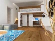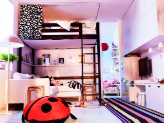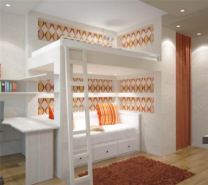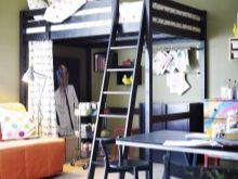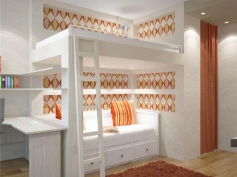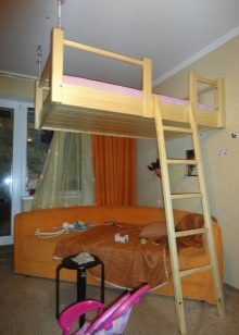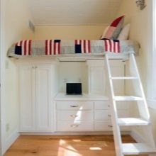 - Design multifonctionnel. Un lit mezzanine aidera à organiser l'espace correctement afin que le lit n'interfère pas avec les activités de la journée. Sous le lit, vous pouvez créer un espace de travail, créer des étagères ou mettre une armoire.