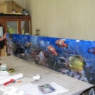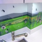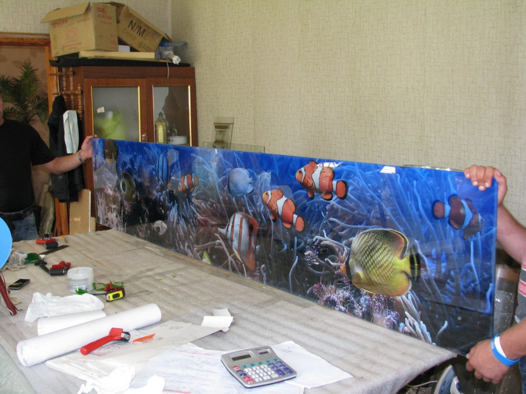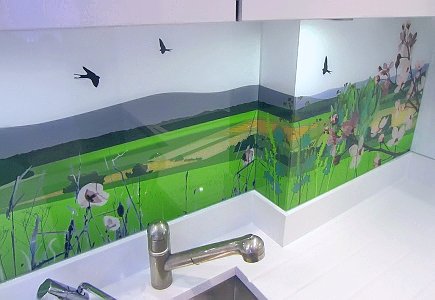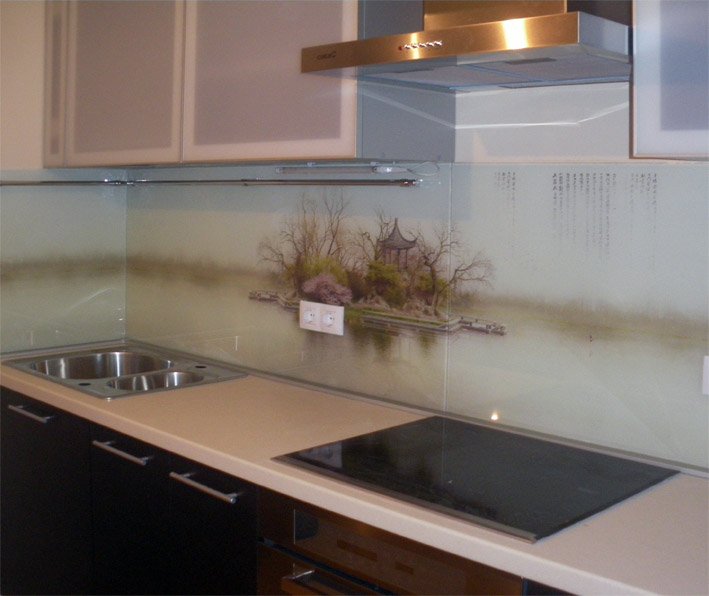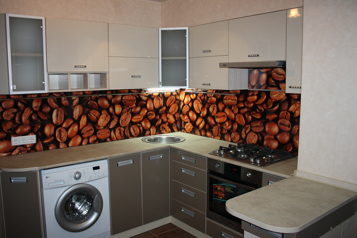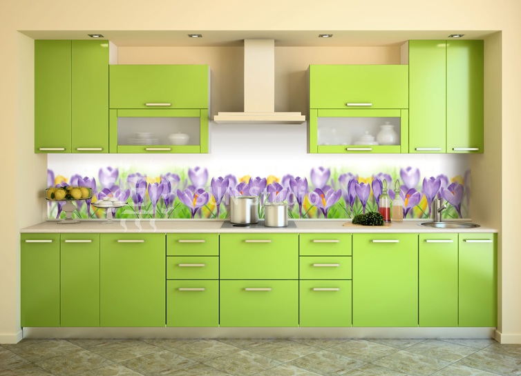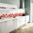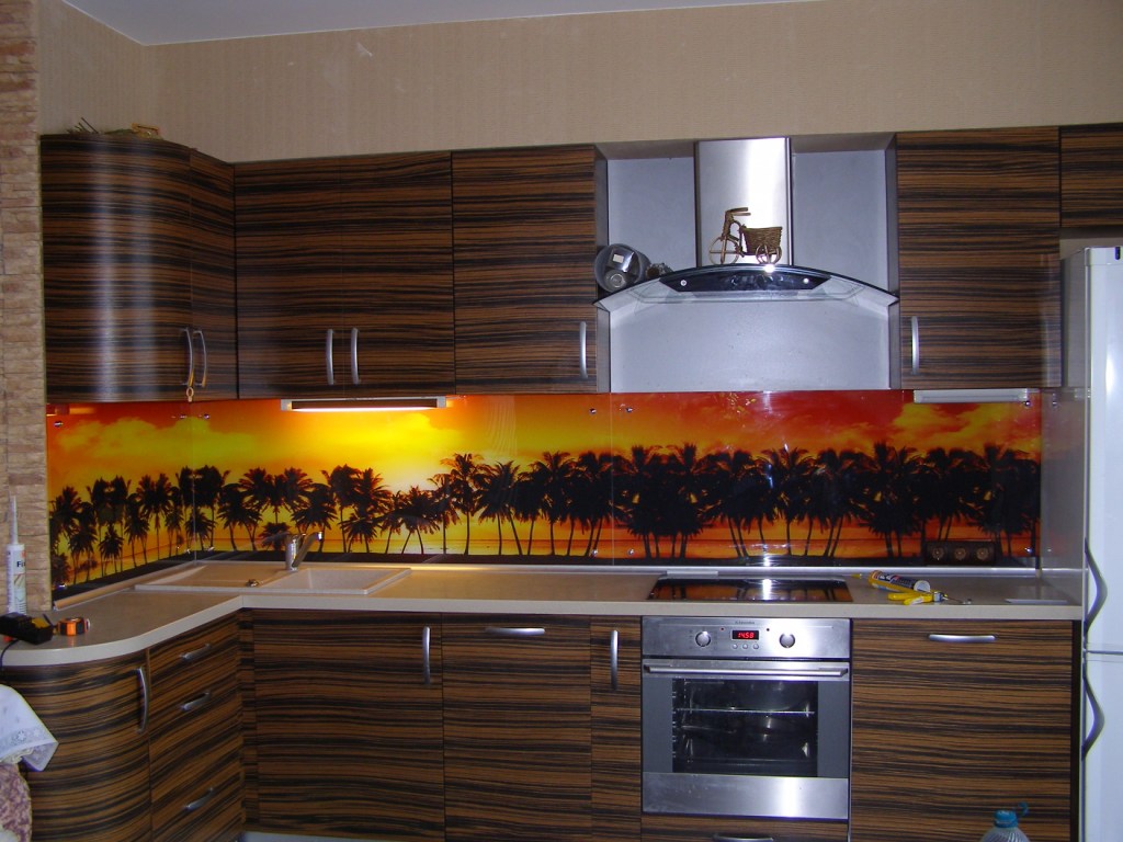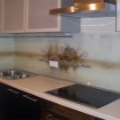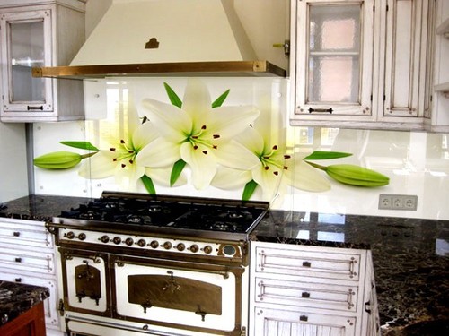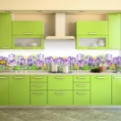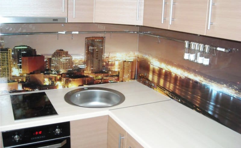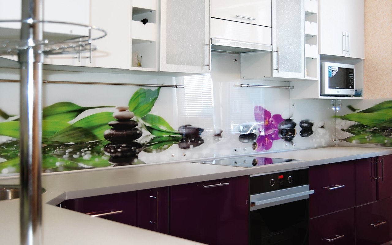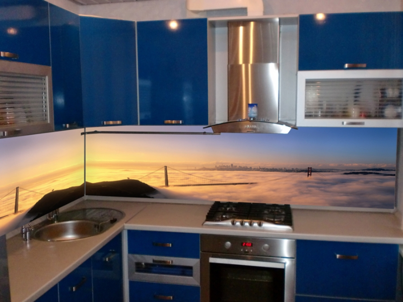 Pour créer les tabliers de cuisine originaux, on utilise souvent des feuilles de plastique imprimées avec des photos. Il a l'air très lumineux et devient le centre d'attention de toute cuisine. Vous pouvez acheter des solutions toutes faites et vous pouvez également imprimer et commander des photos, avec l’image de votre choix.
