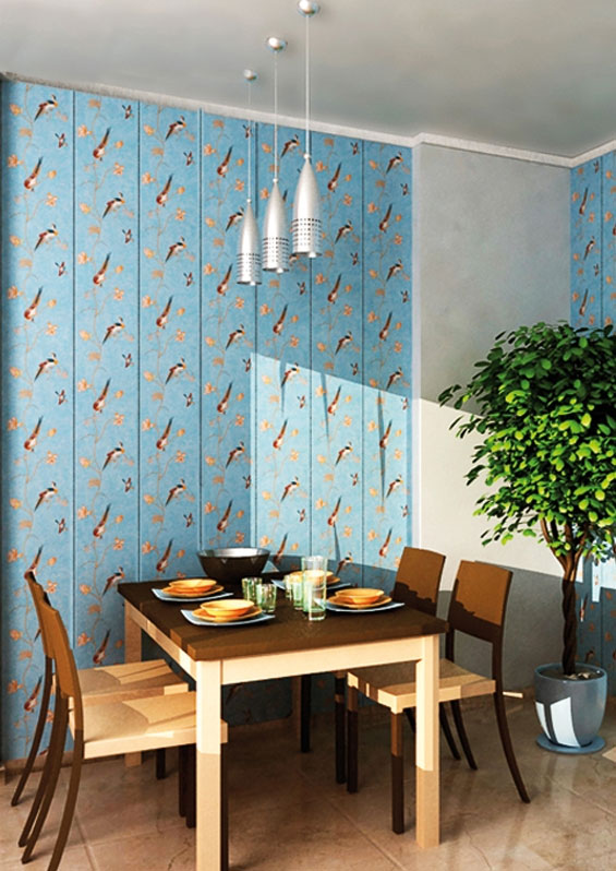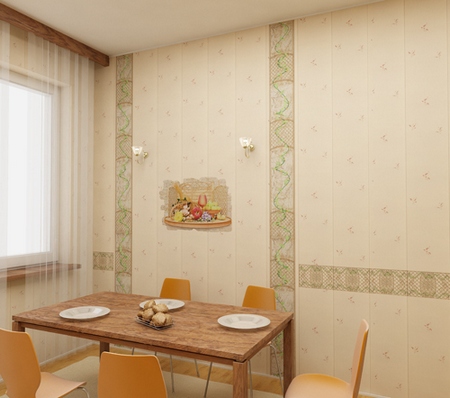 Les panneaux en plastique finissent généralement le tablier de la cuisine. Cependant, il est tout à fait acceptable de les remplacer par le papier peint ou le plâtre habituel. Il existe également une option de compromis lorsque la moitié du mur est recouverte de feuilles (par exemple, du sol au milieu, de sorte que les murs ne soient pas endommagés par les meubles). Dans ce cas, le plastique est associé à du papier peint et peut très bien compléter le design.
