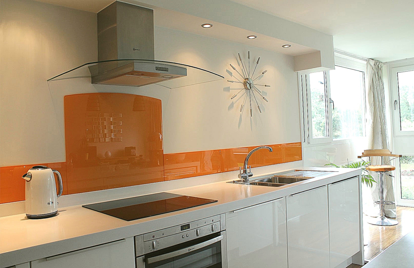 À l'intérieur d'un style moderne lisse, panneau de miroir s'adapte parfaitement. Dans cette cuisine sans casiers muraux, toute l'attention est rivée au mur. Le plastique gainé non seulement le tablier, mais toute la surface du mur jusqu'au plafond. La simplicité du motif est complétée par des montres originales et un style futuriste.Le centre logique de la composition - la zone située au-dessus de la dalle - est mis en évidence avec un accent orange vif.