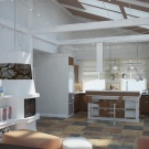 Une option intéressante pour la cuisine campagnarde dans un appartement moderne. Comme il se doit, des matériaux naturels aux teintes naturelles apaisantes sont utilisés dans la décoration. Sol en pierre grise en harmonie avec le plafond en bois naturel. Le plan de travail se marie parfaitement avec une cuisine moderne à un niveau. Un peu rugueux finition murs dilués peints dans les tons gris clair et foncé.