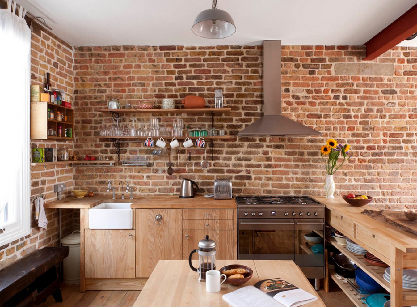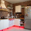 - Briquetage La cuisine d'origine dans le style du "loft". Malgré le fait que tous les murs soient décorés de la même façon, l'espace au-dessus du niveau inférieur ne semble pas vide.
