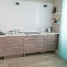 - Le panneau en bois aggloméré laminé.Le tablier est fait de bois de très belle qualité, en raison également de la couleur contrastante, il permet de zoner l’espace en soulignant la zone de travail sur un fond blanc des murs et du plafond restants.
