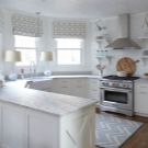 - Île. Une option de conception intéressante pour une petite cuisine dans laquelle la zone de travail est située au centre et des étagères ou armoires-colonnes situées le long des murs.