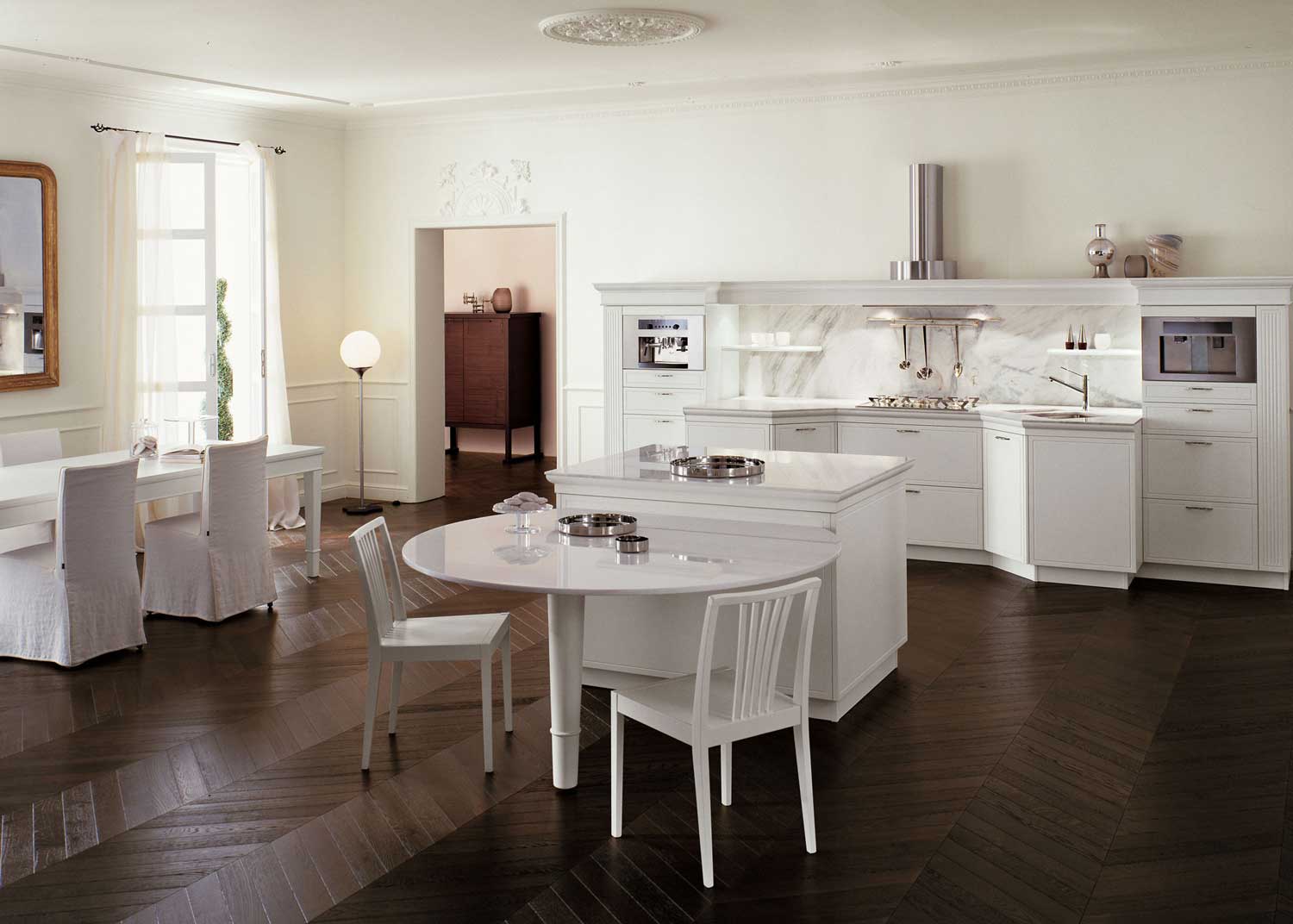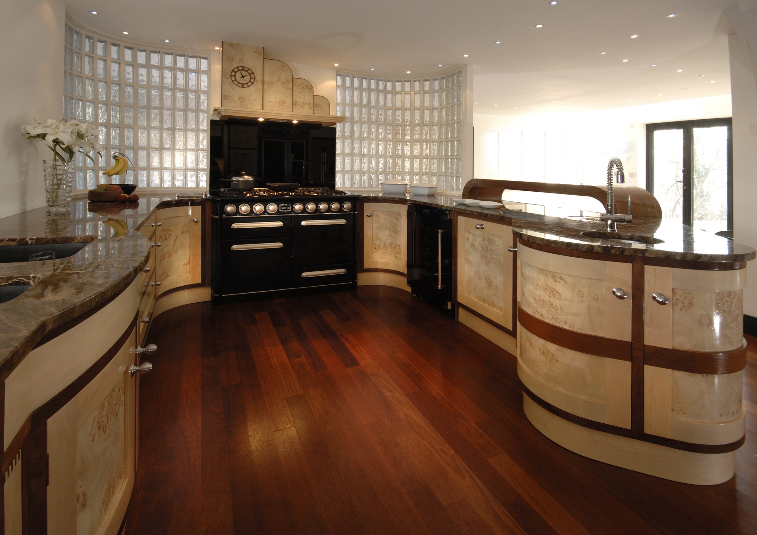Ce style se distingue par un luxe particulier et chic, le plus souvent, le design luxueux de la cuisine est utilisé dans des appartements spacieux et des maisons de campagne, où la zone de cuisson est combinée avec talent au salon ou à la salle à manger.