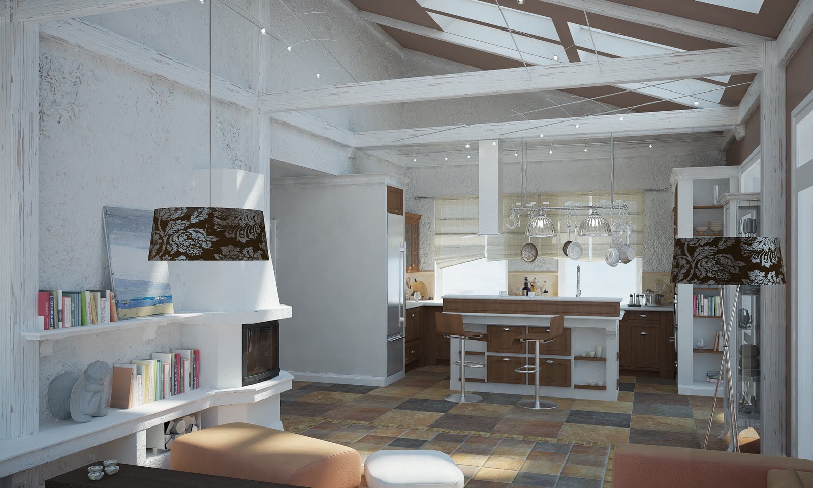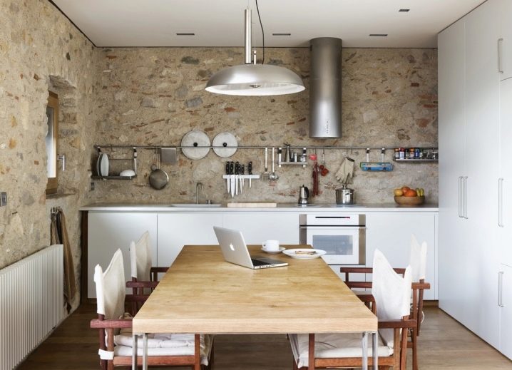 - Maçonnerie de style loft brut a l’air original et très confortable; Il est parfaitement combiné avec des panneaux en bois et des meubles de cuisine modernes en métal.