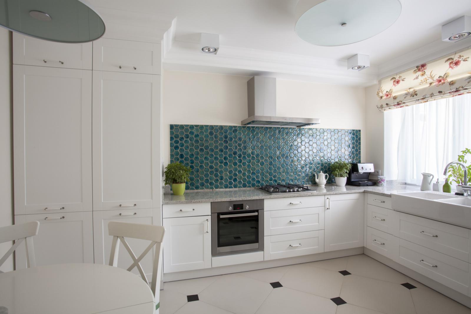 Un exemple de style moderne classique avec des accents brillants (Fig. 19). Le design de cette cuisine est élégant et stylé. Un mobilier blanc rectangulaire avec des plans de travail noirs, un lustre et un sol classiques, des points lumineux sous la forme de chaises dorées et des mosaïques originales au-dessus de la zone de travail sont la clé d'un design moderne et réussi.