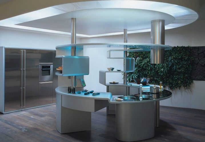 Avec l'aide de la technologie moderne, vous pouvez «faire revivre» de nombreuses idées futuristes à l'intérieur de la cuisine. Les nuances d’acier et de blanc sont la base de ce style, qui peut être facilement dilué avec des détails riches sous la forme de meubles originaux ou de peintures murales. N'oubliez pas la caractéristique principale du futurisme - une forme de mobilier inhabituelle et souvent incurvée.