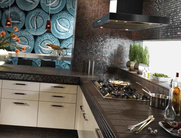 - Mosaïque en céramique. En noir, un tel design de tablier est très impressionnant. Dans cet exemple, la cuisine est faite dans le style du "minimalisme". Les autres murs sont parfaitement combinés avec la zone de travail, car ils sont peints dans une couleur similaire gris argenté.