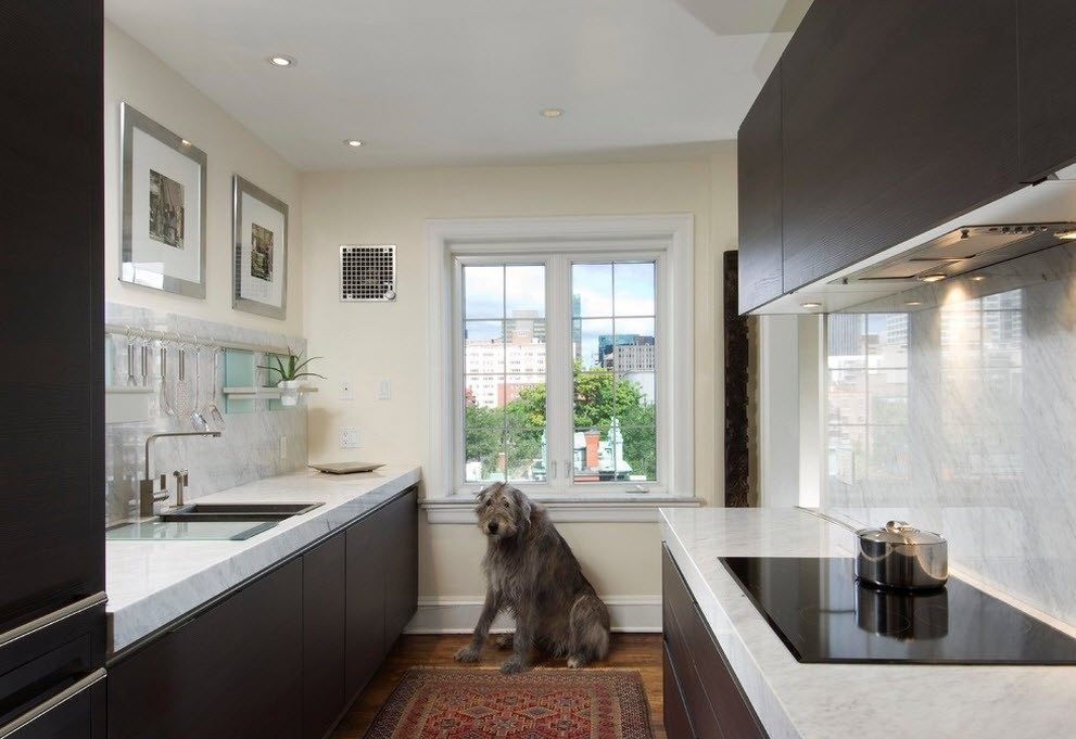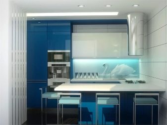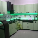 - Pour les cuisines petites et étroites, choisissez des couleurs claires et des revêtements réfléchissants brillants. Il est également préférable d’utiliser le rétroéclairage de la zone de travail.