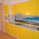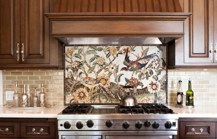 Vous pouvez également associer une photo à un tablier en mosaïque en céramique, en smalt ou en métal. morceaux de pierre et de verre. Seul un professionnel peut faire un dessin sur un tel tablier, son coût sera donc beaucoup plus élevé, mais la beauté de la cuisine exige des sacrifices. L'inconvénient est que, lors de l'installation, des joints peu hygiéniques peuvent se former, avec un soin particulier de la cuisine, un tel inconvénient ne sera pas un gros problème.