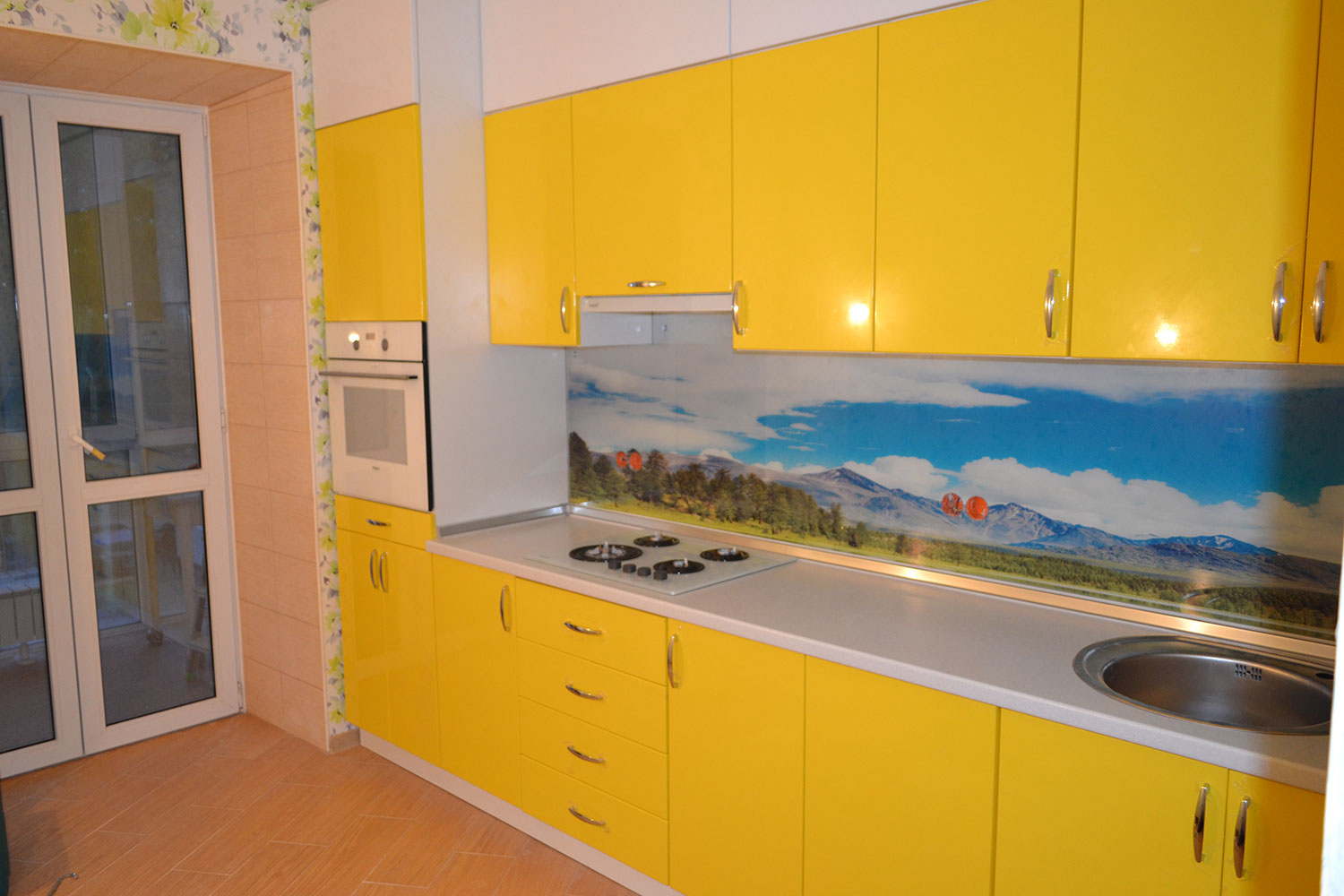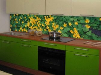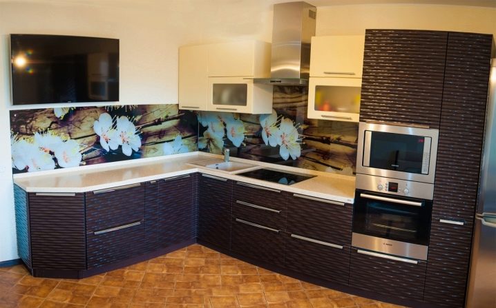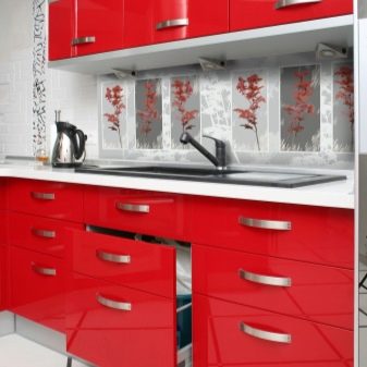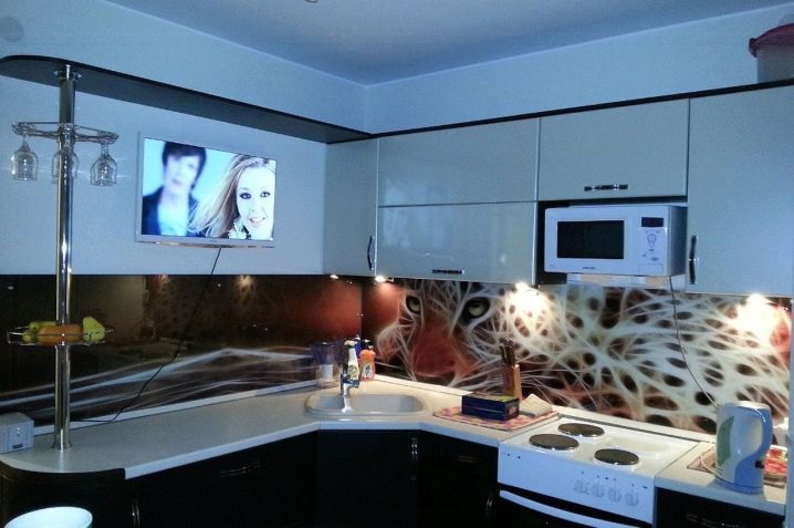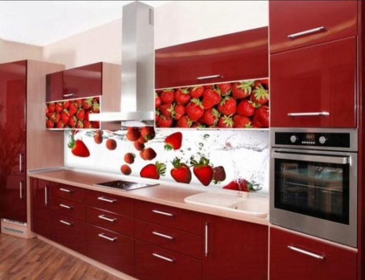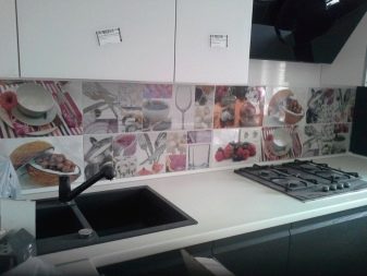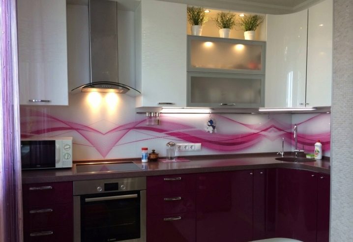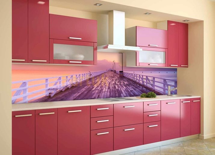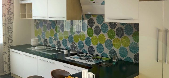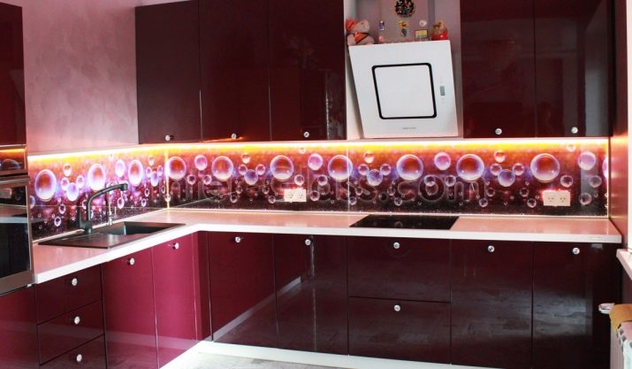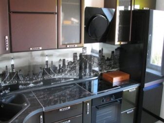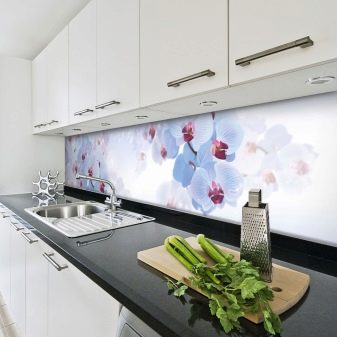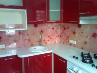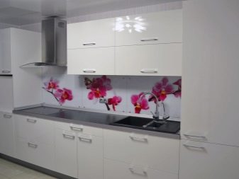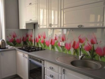 Un tel tablier photo permet d'économiser de l'espace, ce qui est idéal pour les petites zones, agrandit et agrandit visuellement l'espace. Un autre avantage est la simplicité et la facilité d'entretien, il suffit de nettoyer la surface en temps voulu et de l'essuyer avec un chiffon doux.