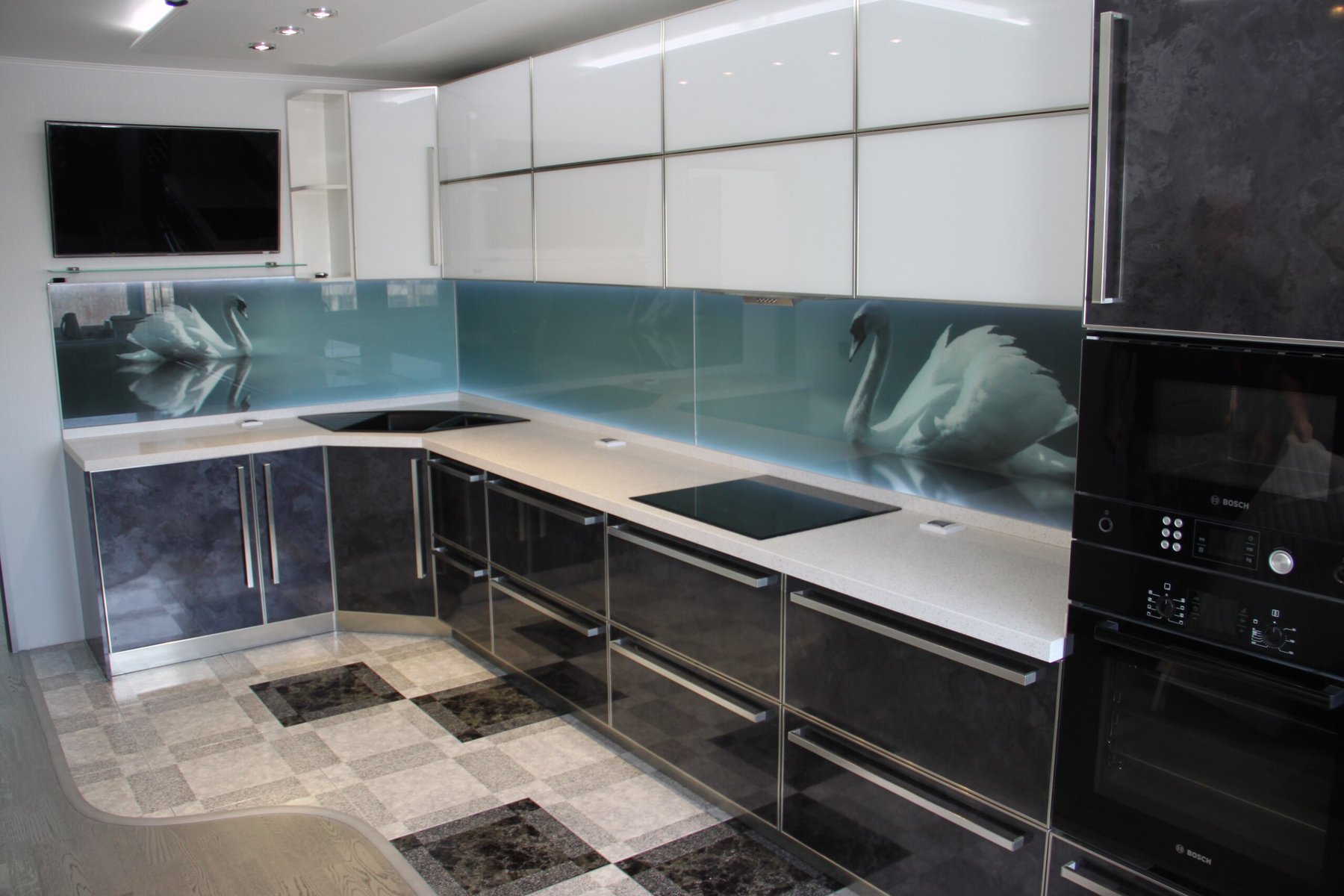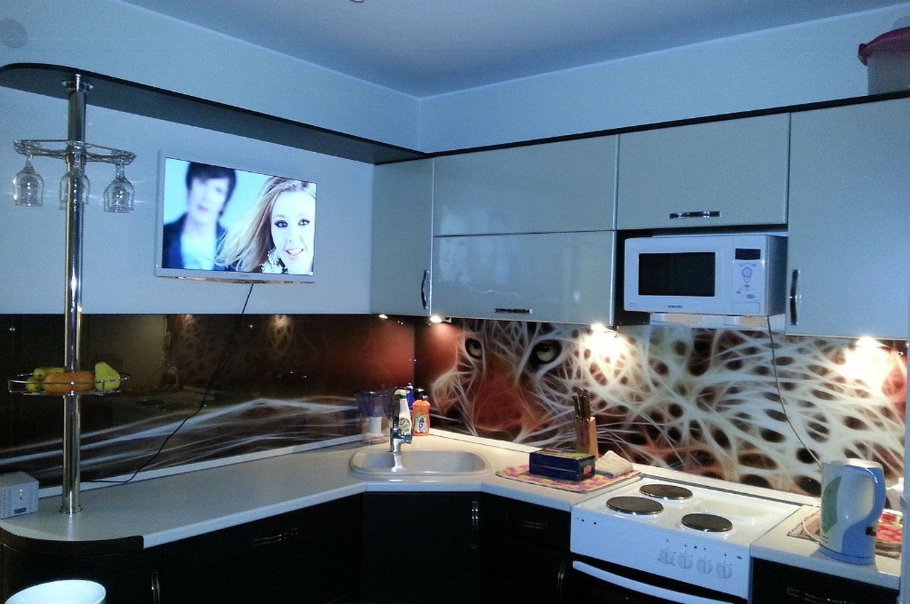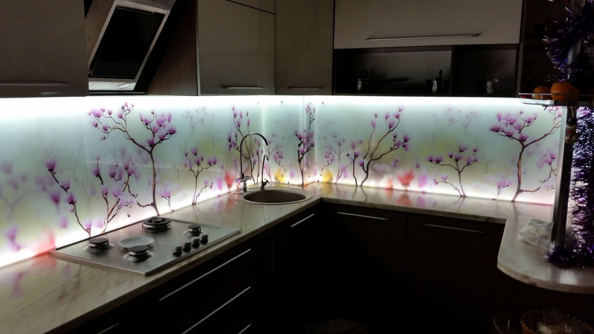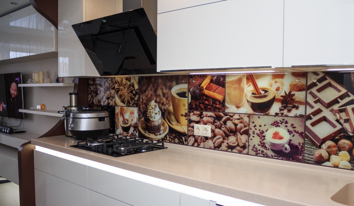 Tablier photo en verre pour la cuisine est assez cher. Le coût inclut non seulement les consommables, mais également la complexité de la fabrication du panneau, qui comprend les mesures, les découpes pour les douilles et les fixations.