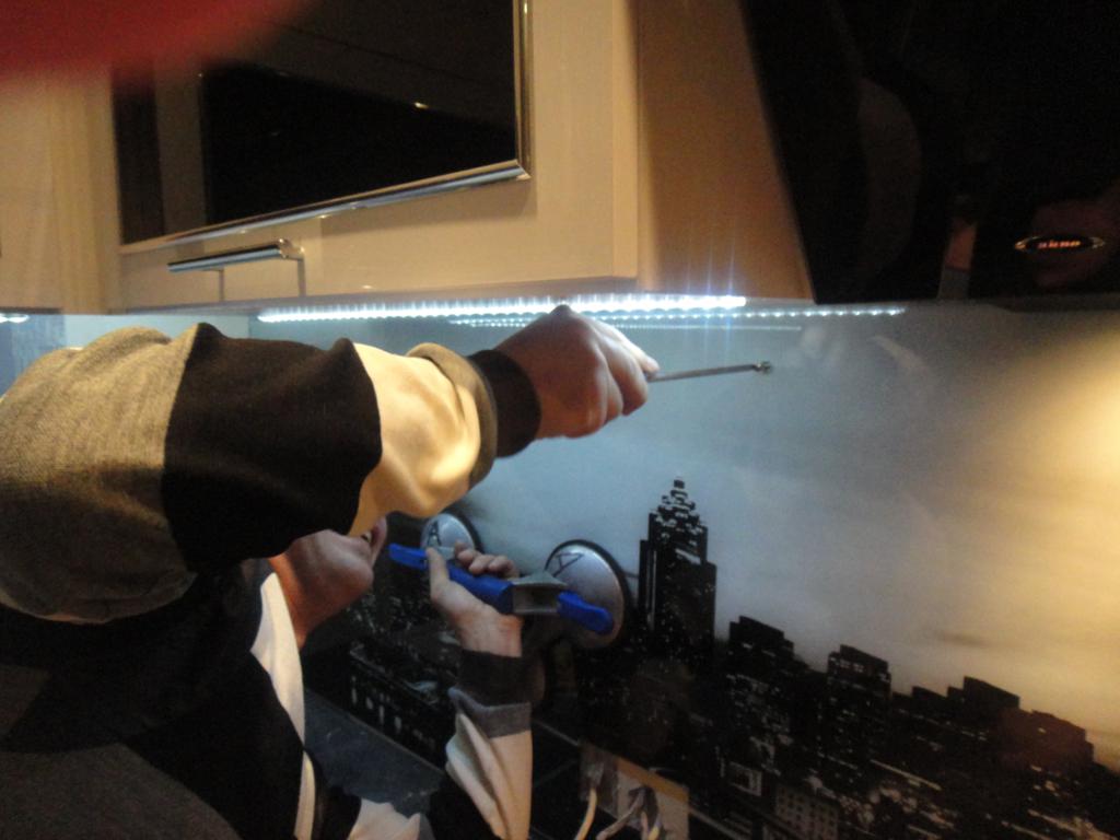 Tous les articles sont entreposés dans des locaux industriels, car toute imprécision pouvant avoir des conséquences irréparables, le panneau devra être refait. L'installation est effectuée uniquement après le montage complet du meuble de cuisine.