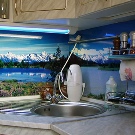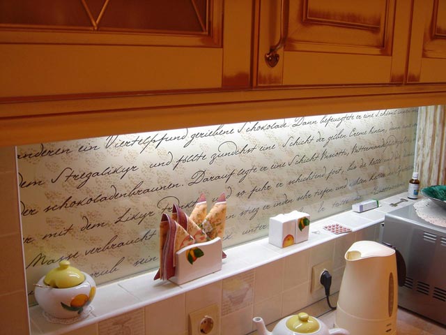 - Les autocollants sur le tablier de la cuisine sont plus durables et dureront plus d'un an.Vous ne pouvez pas vous inquiéter et collez-les à la surface près du poêle ou de l'évier. Les autocollants sont traités avec une substance spéciale et ne craignent ni les changements de température, ni le contact avec l’évaporation de l’eau ou des graisses.