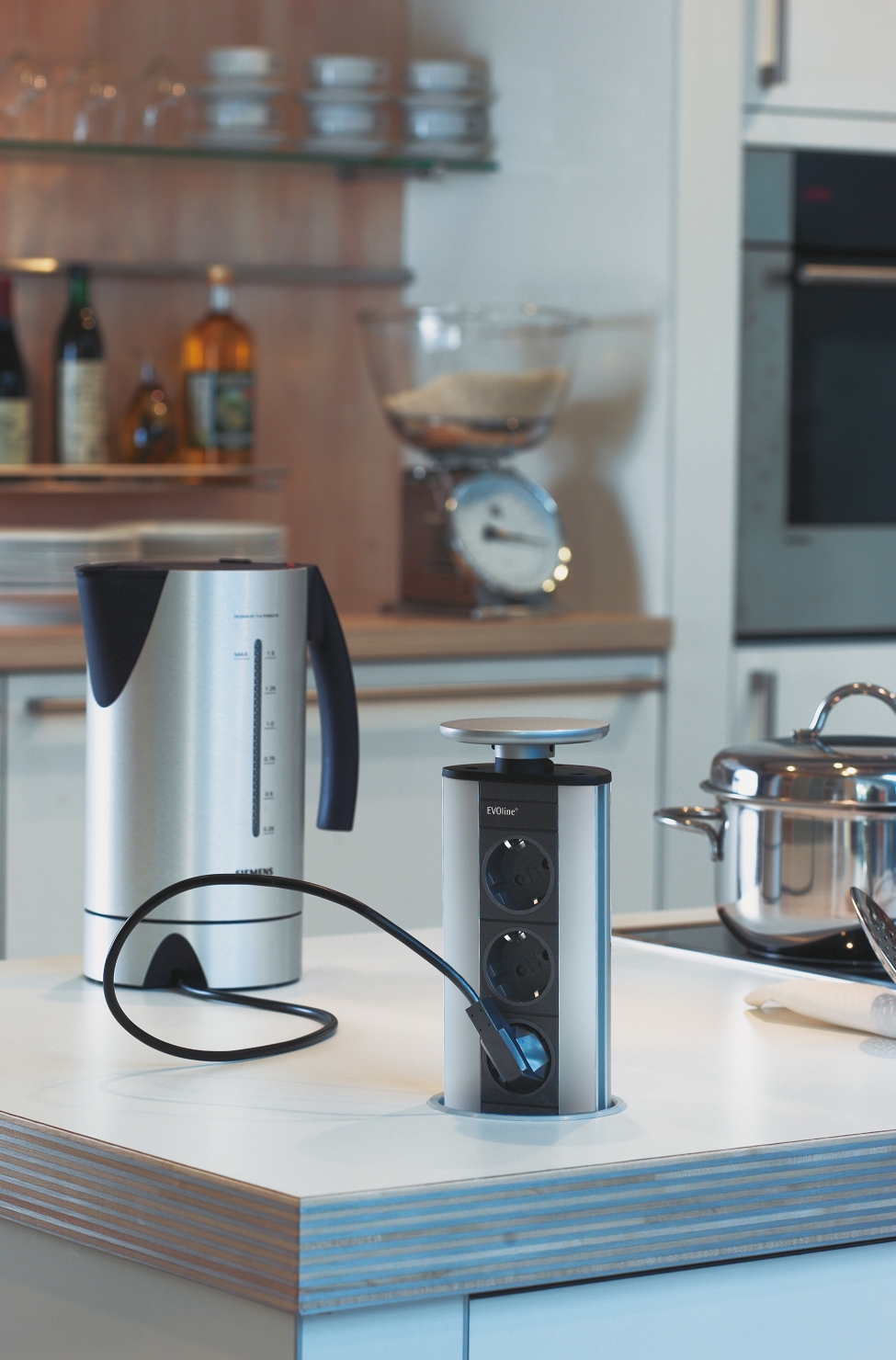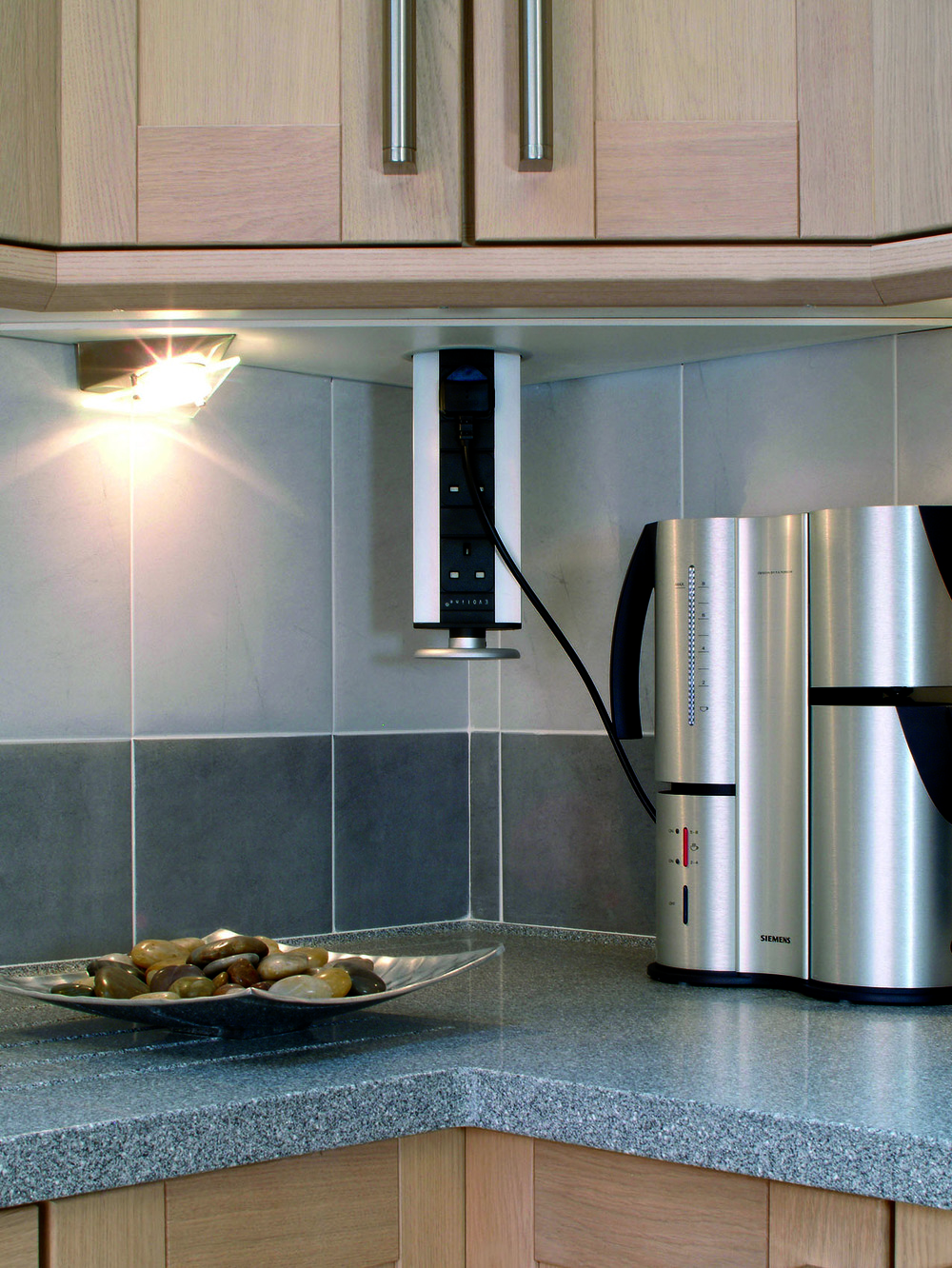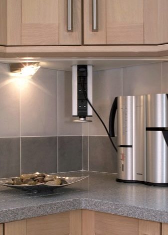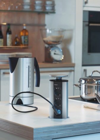 Aujourd'hui, très souvent, utilisez les soi-disant points de vente rétractables. Ils sont situés à l'intérieur du tablier de MDF.Par conséquent, il n'y a pas de fils à la surface. Un tel produit peut être tourné dans n'importe quelle direction. Mais c'est probablement plus beau que pratique. Lors de l'installation, rappelez-vous: