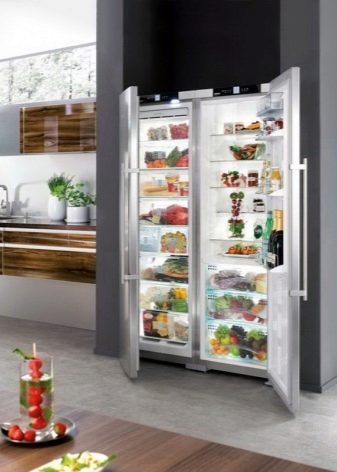 Les réfrigérateurs à deux compartiments de ce type diffèrent des autres modèles par la disposition des chambres. Ils sont disposés côte à côte, comme des portes d'armoires.