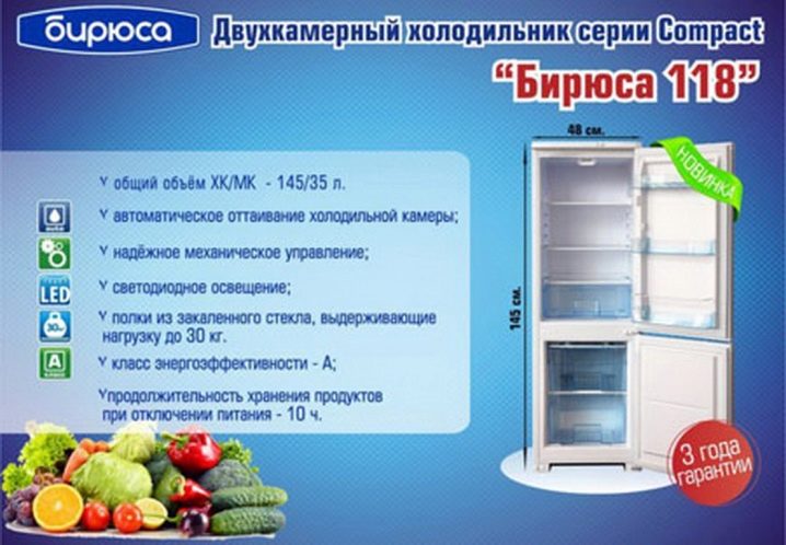 Les principales caractéristiques des réfrigérateurs à deux compartiments "Biryusa" sont les suivantes: