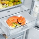 La fonctionnalité du modèle est également au plus haut niveau: les étagères sont agencées de manière aussi ergonomique que possible, ce qui simplifie grandement leur utilisation. La zone de fraîcheur étant sèche, il est impossible de conserver longtemps les légumes et les fruits, mais la viande sera toujours parfumée, savoureuse et nutritive. Grâce à la fonction de dégivrage automatique, vous pouvez oublier le besoin de décongeler.