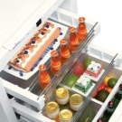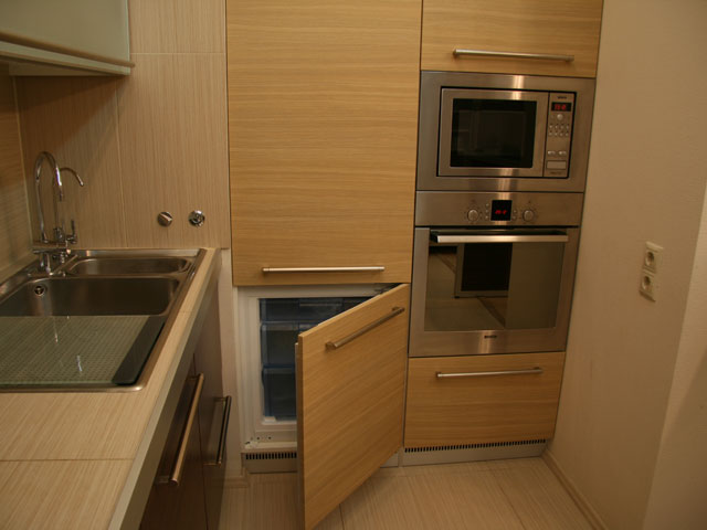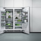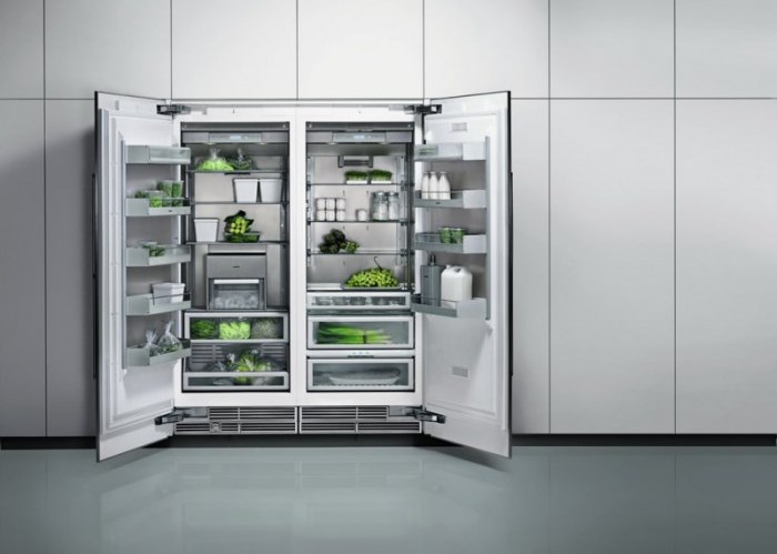 - Technologie entièrement intégrée. Le cas d'un tel réfrigérateur dans ce cas, le tout se cache derrière les portes d'armoires ou de cabinets. Pour organiser le dispositif de cette manière, il est nécessaire de sélectionner les dimensions appropriées des deux systèmes composites. Certaines modifications des réfrigérateurs sont assez larges, ce qui nécessite l’utilisation de socles à deux portes. L'inconvénient de cette méthode d'installation est l'angle d'ouverture limité des portes, qui ne dépasse souvent pas 90 degrés. Pour vous débarrasser de ce défaut, appliquez des ustensiles de cuisine équipés de portes coulissantes.