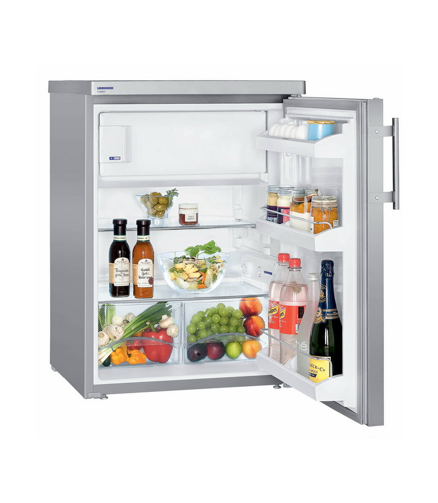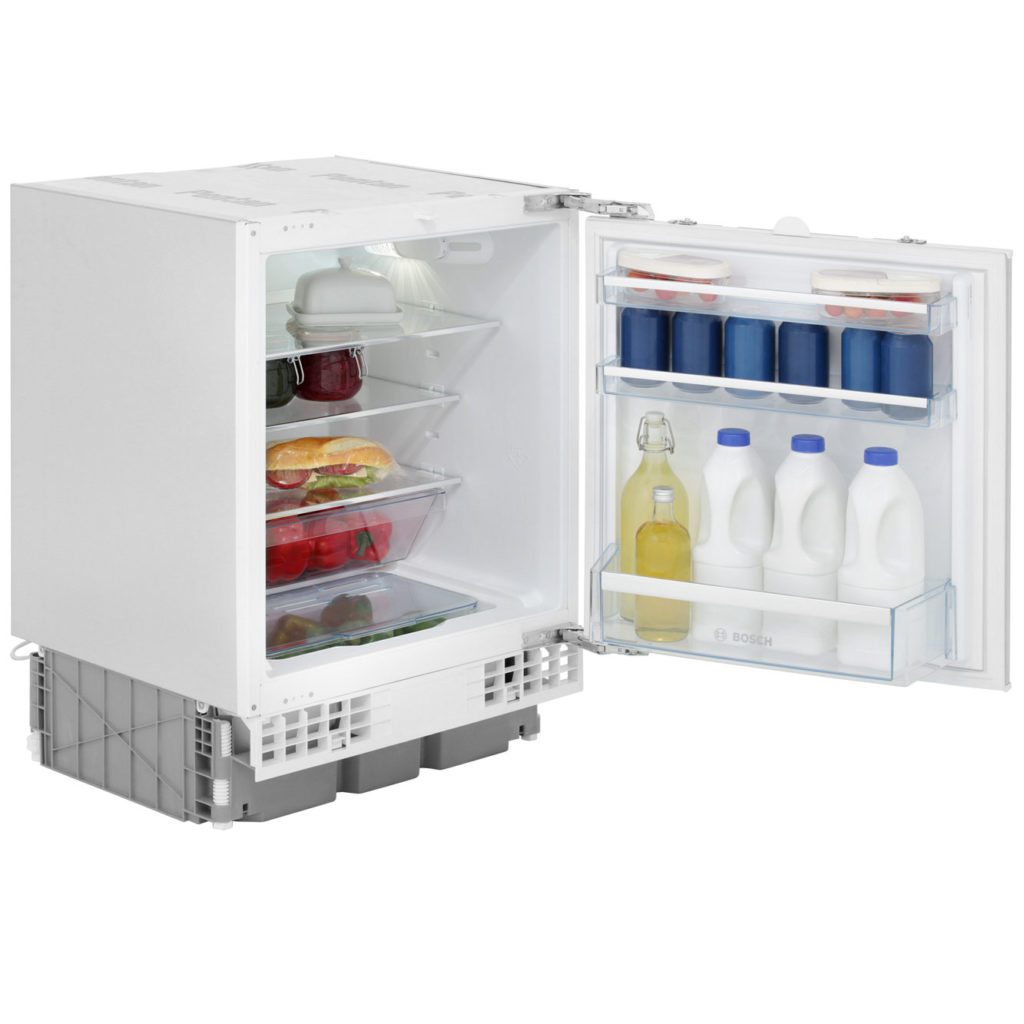 - Bosch KUR 15A50. Le réfrigérateur est une construction blanche en plastique de haute qualité. Le système consomme environ 146 kWh / an, ce qui représente un achat assez économique. Le niveau de bruit ne dépasse pas 38 dB. Une caractéristique distinctive du produit est la présence d'un revêtement antibactérien. Les dimensions des produits sont 59,8 * 54,8 * 82 cm (w * g * c), ce qui permet de les placer dans la plupart des modules de cuisine standard. Le volume du réfrigérateur est de 141 litres.