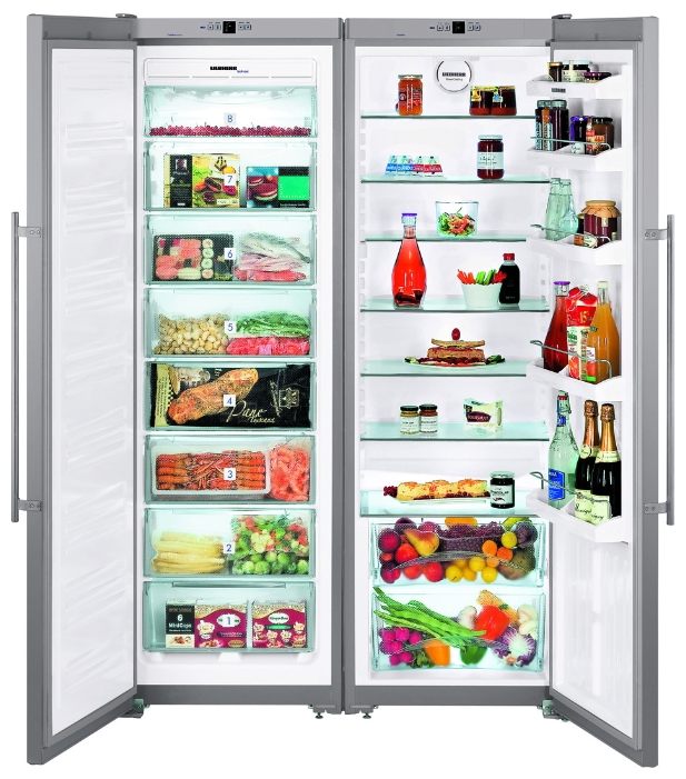 - Liebherr SBS 7212. Cet appareil appartient à la classe des Side-by-Side, ce qui explique le volume de 651 litres. Le réfrigérateur est équipé de deux compresseurs puissants et est capable de maintenir un froid sans électricité pendant 43 heures.