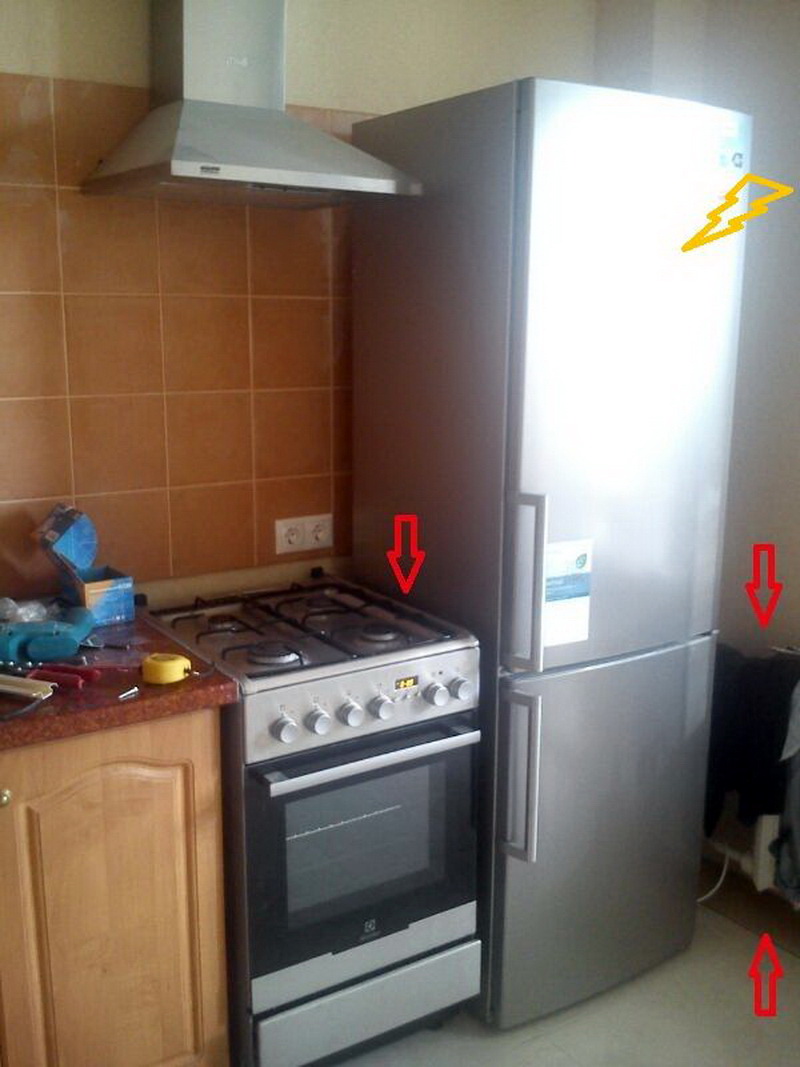 Pour prolonger la durée de vie de l'unité, vous devez vous rappeler que vous ne pouvez pas la placer près d'une source de chaleur. Par exemple, l'installation d'un réfrigérateur près d'une cuisinière à gaz est encore plus dangereuse que près d'un appareil de chauffage. En effet, la batterie ne fonctionne que plusieurs mois par an et le poêle fonctionne en permanence et émet des fumées très chaudes.Et si le réfrigérateur reste près de la cuisinière à gaz, un côté sera constamment soumis à une surchauffe, tandis que l’autre restera froid. Ainsi, il s'avère que les produits à l'intérieur du réfrigérateur seront congelés de manière inégale.