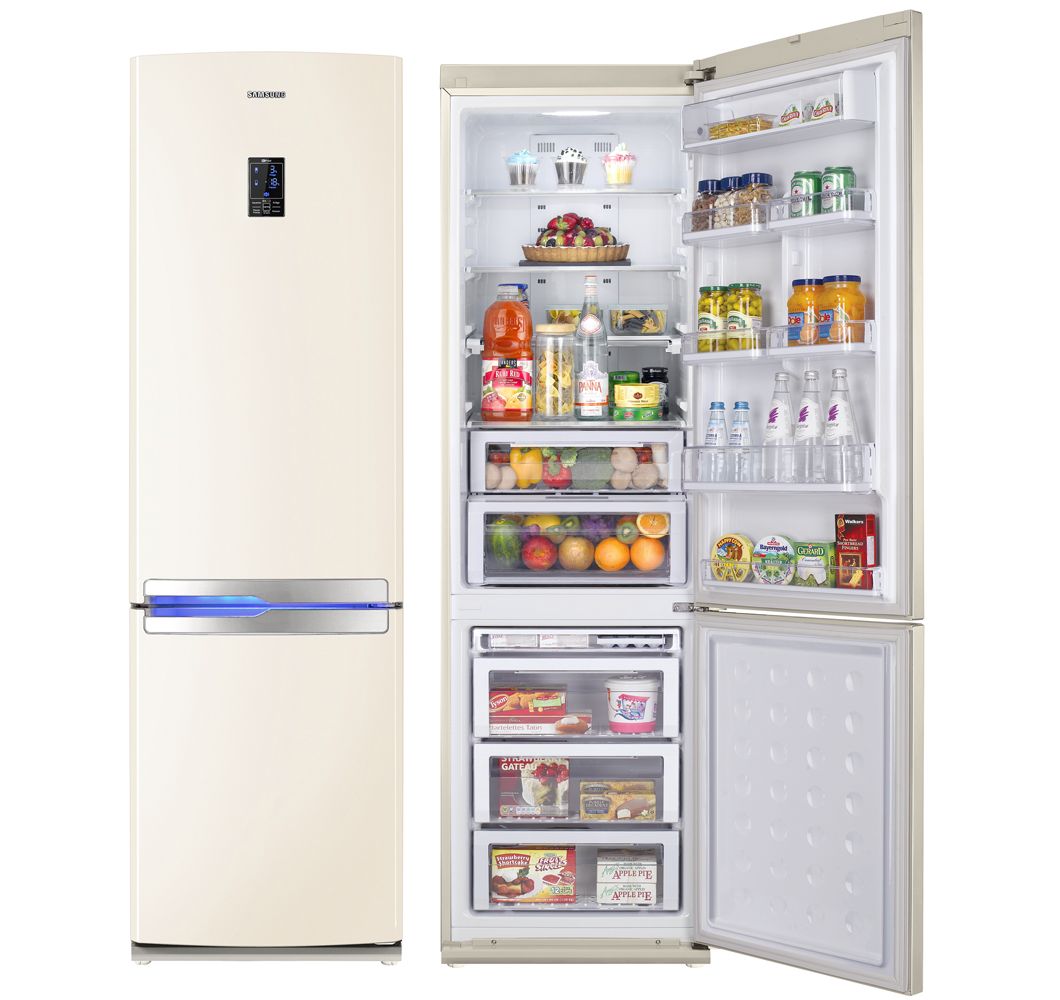 Samsung RB-30J3200EF à cet effet convient parfaitement. Il est beige clair, ce qui permet de le placer dans n’importe quel type de cuisine. De plus, il est grand et spacieux et peut décongeler par lui-même. Le congélateur est en bas.