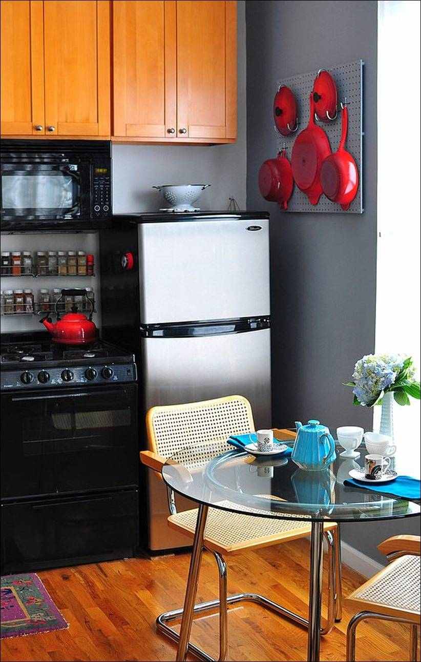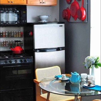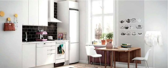 Il est nécessaire de prendre en compte tous les détails - l'emplacement d'autres éléments de la cuisine, tels que des tables, des canapés de cuisine, la présence d'une fenêtre à côté de l'endroit où vous prévoyez d'installer le réfrigérateur, afin de déterminer immédiatement le mode d'ouverture de ses portes.