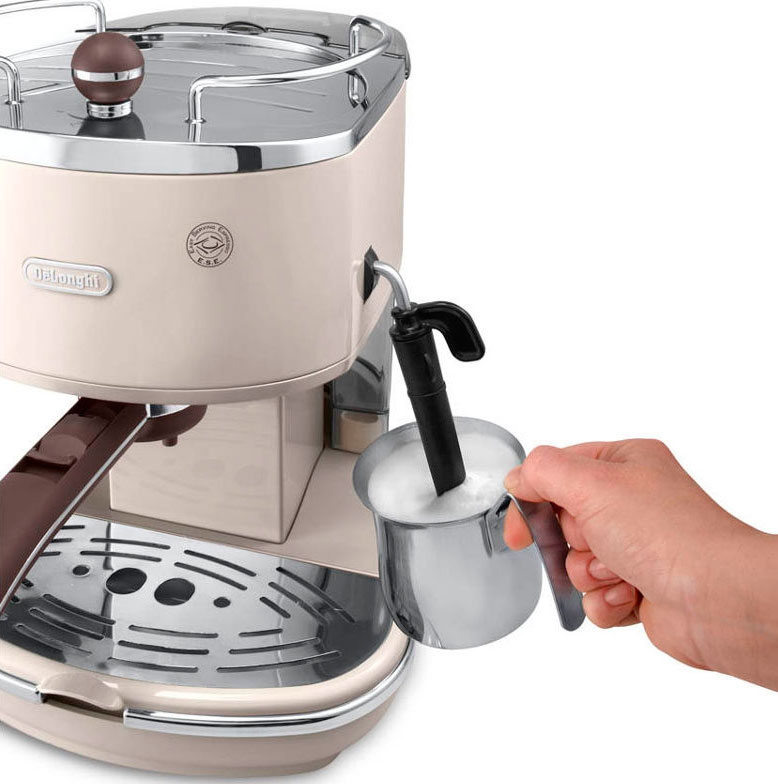 - "DeLonghi" 310 de la ligne de designer "Icona Vintage" préparer professionnellement une boisson à partir de café moulu ou préformé. Le modèle 1100 W, avec une pression de travail de 15 bars et un réservoir d'eau de 1,4 litre, est équipé d'un système de chaudière en acier inoxydable avec thermostats pour l'eau et la vapeur. La divulgation complète du goût du café contribue à la mise en bouteille, préchauffée sur le site, située sur le dessus. Le système à cappuccino mélange l'air, la vapeur et le lait pour former une mousse résiliente. Le contrôle de la machine est disponible même pour un débutant, le récupérateur de gouttes vous permettra de garder la machine elle-même et le lieu d'installation dans un ordre parfait.Les développeurs de la société, en plus du noir classique, ont relevé des couleurs intéressantes pour la cafetière: olive, beige et bleu. Prix - à partir de 15 000 roubles.