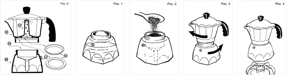 Faire du café est assez rapide et facile. La machine fonctionne sur le principe du geyser. Dans le compartiment inférieur, vous versez de l'eau, un filtre est placé sur le dessus avec un entonnoir spécial où les grains sont versés. Ensuite, l'appareil est placé sur la tuile et le processus de cuisson commence. Quand la vapeur bouillante apparaît. Dans le compartiment supérieur de la machine à café, la préparation de la boisson est effectuée. Le résultat est un café fort, savoureux et aromatique.