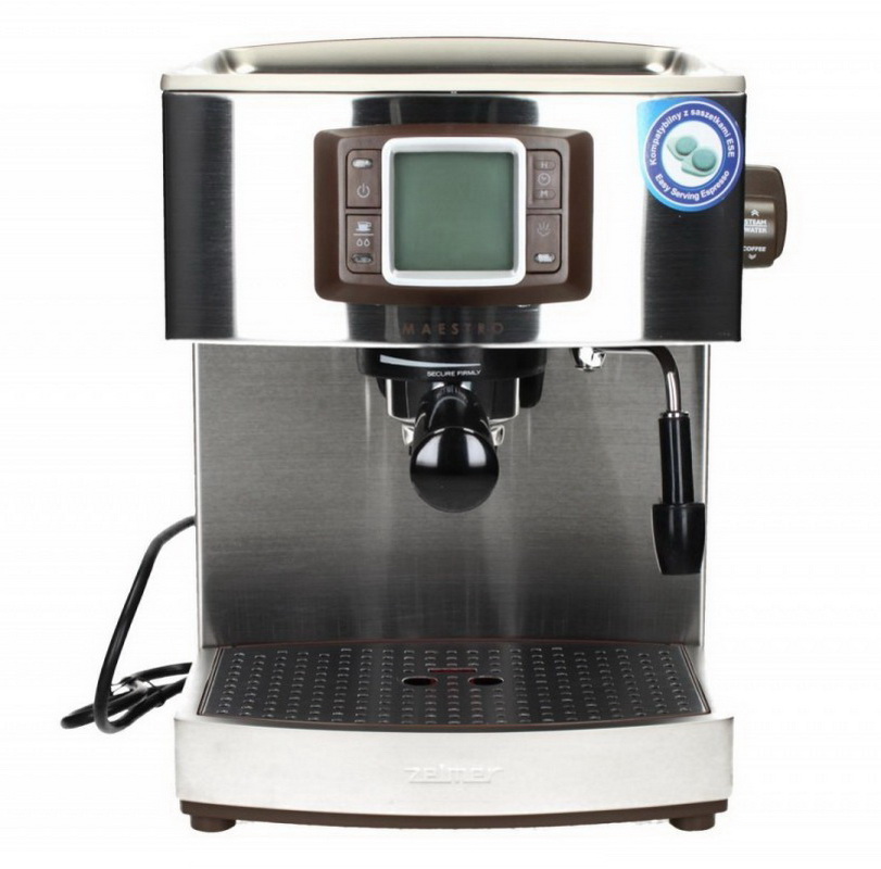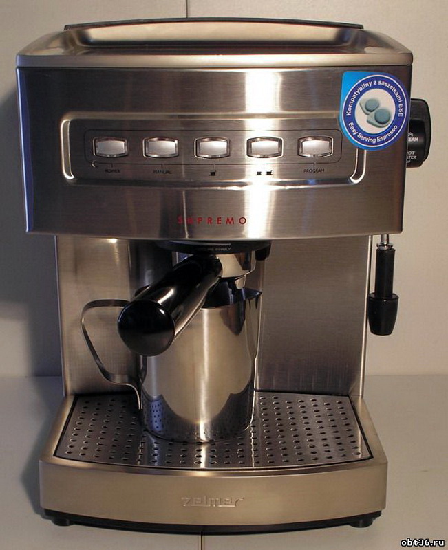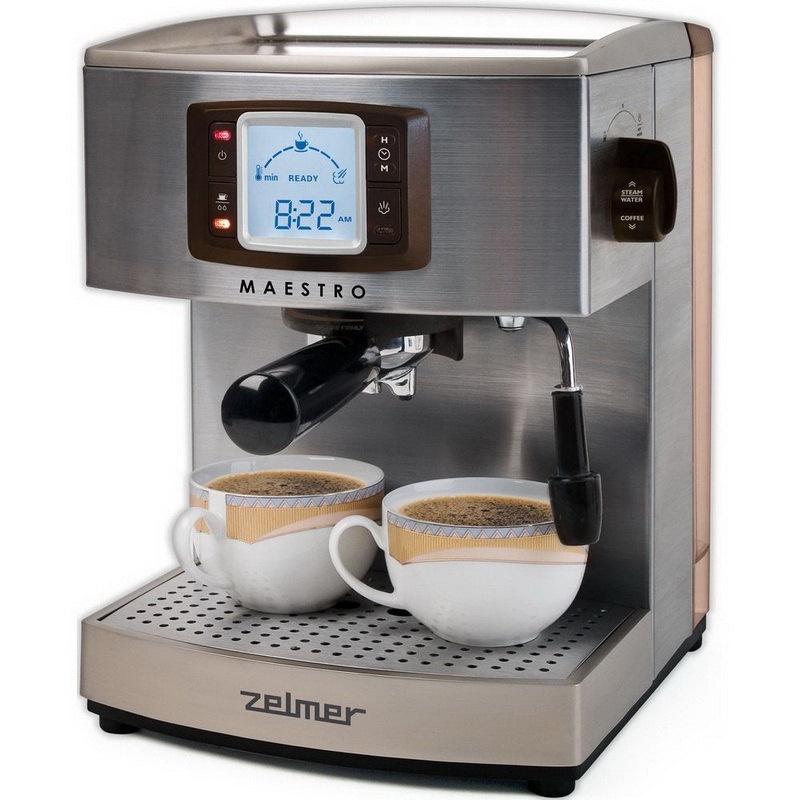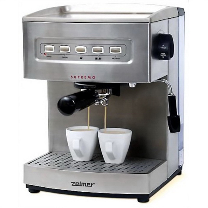 Ce modèle semi-automatique à la fois est capable de préparer un expresso à partir de 2,1 litres d'eau. Le prix d'une telle voiture est d'environ 6 100 roubles. Le boîtier est constitué exclusivement de pièces métalliques. Les inserts en plastique sont absents ici - seulement en acier inoxydable poli. Il n'y a pas d'affichage sur le panneau, il n'y a que des boutons en métal avec une petite LED rouge à côté de la touche marche / arrêt. A l’aide de ces boutons, définissez le nombre de tasses et l’un des programmes qui seront utilisés pour préparer le café. Vous pouvez définir le contrôle manuel de l'ensemble du processus. Modèle "Supremo" peut être appelé une cafetière-mnogostanochnitsy, car il peut être utilisé pour faire du café à partir de poudre et de gousses. Vous pouvez utiliser une buse spéciale, incluse dans tout ensemble de cafetières polonaises. Zelmer. La vapeur dans cette machine est fournie avec une pression de 18 bars.