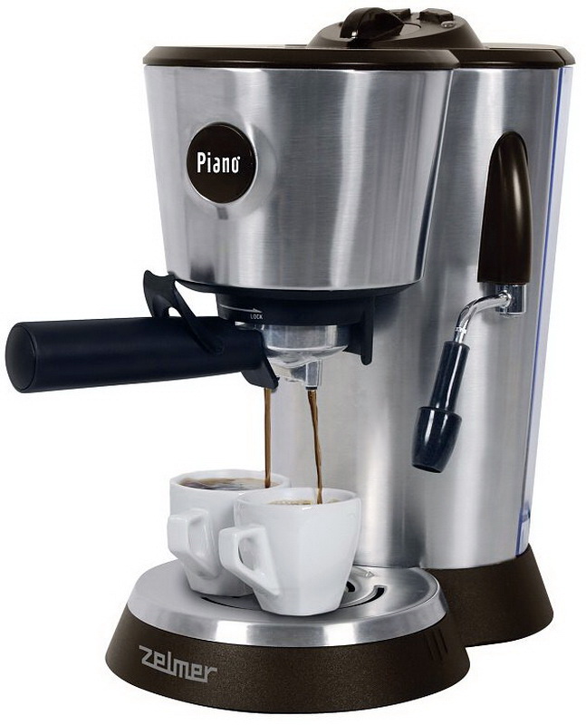 Ce modèle polonais est le meilleur en valeur (3 600 roubles) et très compact. La cafetière à expresso qui prépare le café sous pression a un nom très romantique. Son corps est fait en forme de cylindre, ce qui le compare avantageusement aux autres modèles traditionnellement rectangulaires. Ces cafetières sont noires, brunes et rouges. En règle générale, le corps est en acier inoxydable et les éléments enfichables de la couverture pour la fermeture des récipients avec de l'eau et de la poudre pilée, le plateau et le fond sont colorés. Ils contrastent agréablement avec les notes argentées dans la conception du boîtier. Dans le modèle "Piano" Il existe deux canaux pour la délivrance du produit fini, de sorte que le café puisse être versé dans deux tasses.Toutes les cafetières espresso de cette marque présentées sur le marché ne seront pas aussi bonnes que le modèle. "Piano Zelmer". Sa caractéristique est dans un système de chauffage conçu d'une manière spéciale. L'eau d'un réservoir de 1,2 litre passe dans des canaux étroits d'une capacité de chauffage totale de 1,2 kW, de sorte qu'elle se réchauffe rapidement et qu'elle alimente les noyaux au sol. Certains autres appareils de ce fabricant polonais ont la même différence.