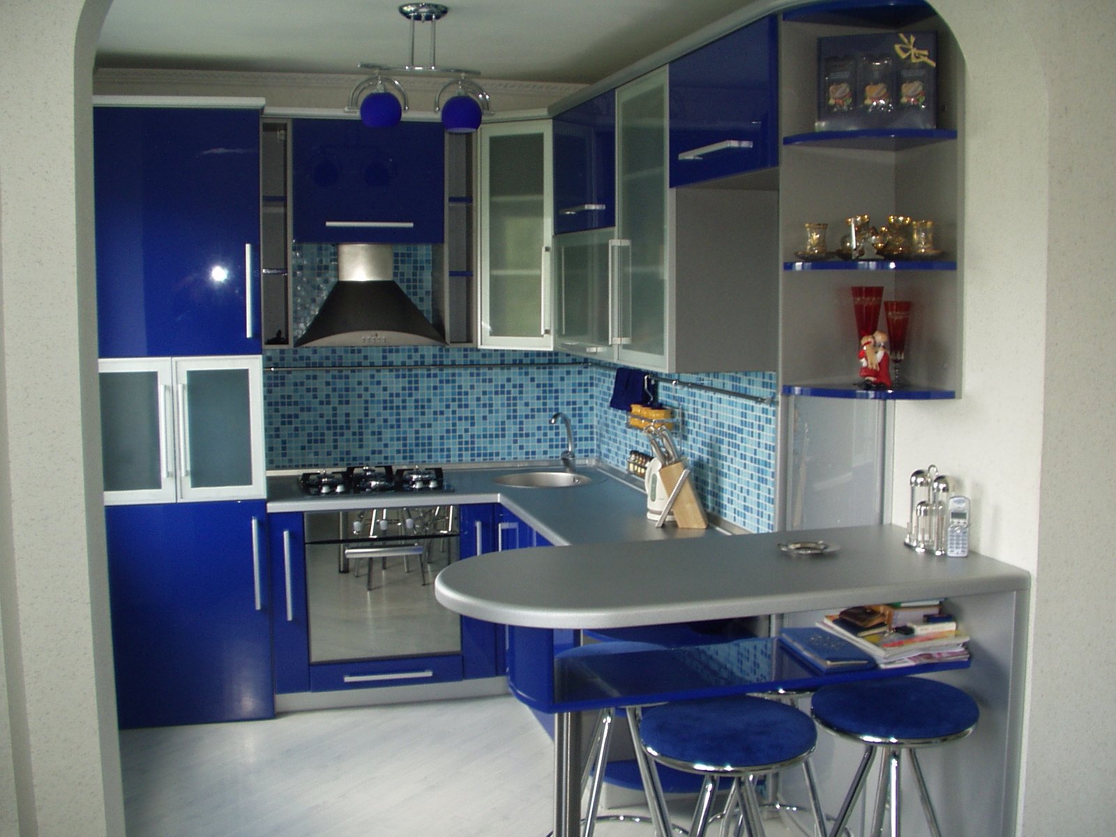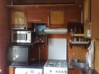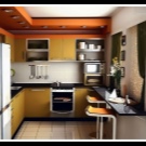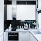 Hottes de cuisine. C'est un must pour une petite pièce. Les odeurs s'accumulent dans un petit espace et accumulent de la graisse. Pour faciliter le nettoyage et préserver l'aspect esthétique du set de cuisine, la hotte est tout simplement nécessaire. S'il s'agit d'une option fixe, vous pouvez placer une étagère au dessus des épices ou des éléments décoratifs. Ou vous pouvez choisir un design rétractable. Premièrement, cela prend peu de place utile. Et deuxièmement, la hotte rétractable vous permet de construire une autre armoire pour les ustensiles de cuisine.