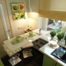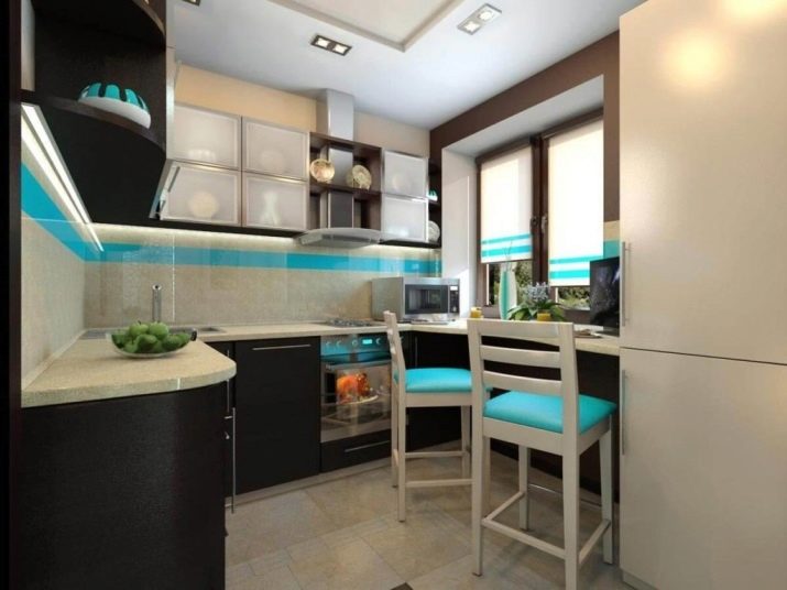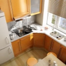 Coin repas. En choisissant des échantillons de meubles pour "Khrouchtchev" ou un autre projet d'appartement avec un petit coin cuisine, évitez les meubles aux angles aigus. Cela vous protégera, ainsi que votre ménage, contre d'éventuelles blessures lors de l'inévitable collision. Au lieu de la table rectangulaire habituelle, vous pouvez faire une barre qui sera perpendiculaire au bureau et sera son extension naturelle. Une excellente solution serait d’agrandir le rebord de la fenêtre et de l’intégrer à la table à manger avec un plateau rabattable ou fixe.