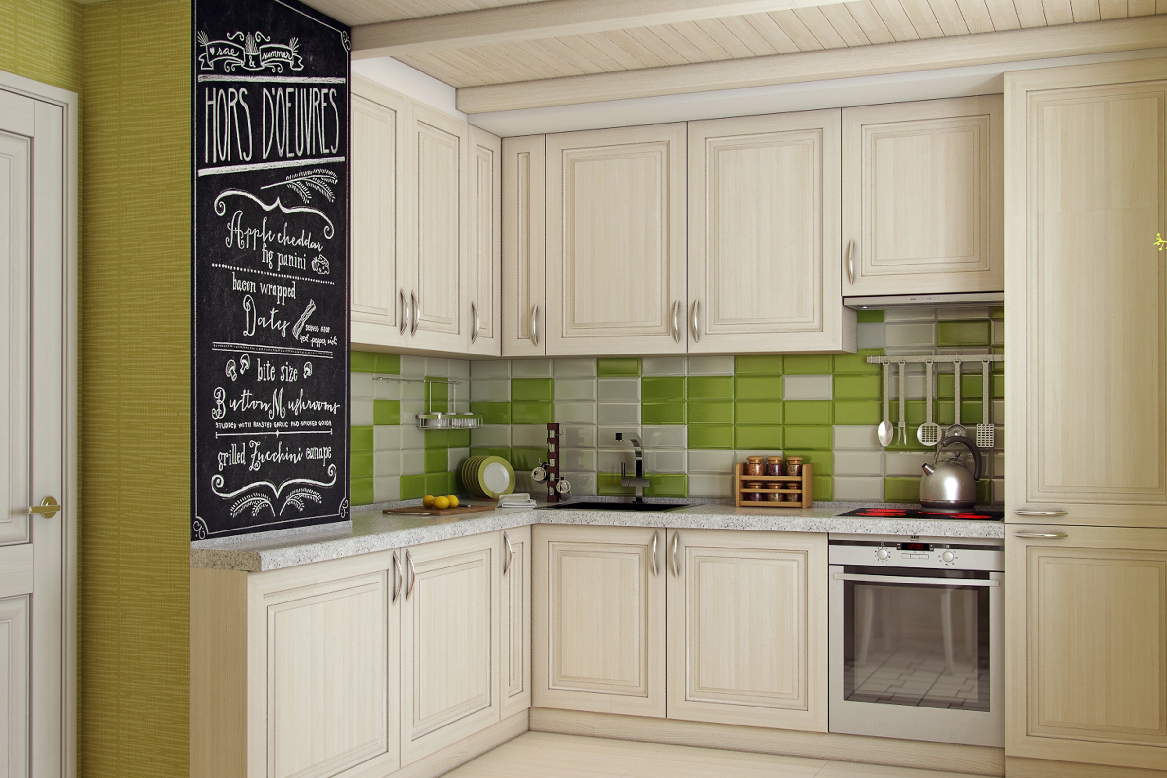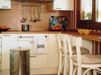 Utilisation de systèmes de garde-corps. Il existe trois types de rails.Ils peuvent être positionnés verticalement, horizontalement et en angle. Cette conception élégante transformera la cuisine et facilitera grandement la tâche d'une disposition compacte de meubles. Pour éviter de surcharger un grand nombre d'objets, les concepteurs recommandent de choisir des rails de la couleur du mur en fonctionnement de manière à ce qu'ils soient moins visibles.
