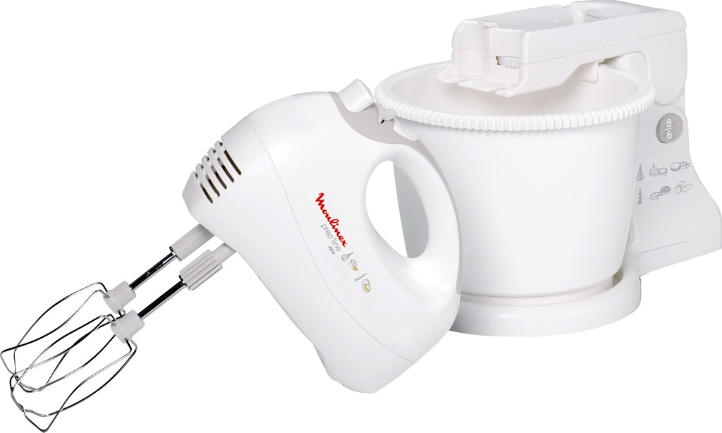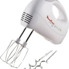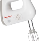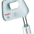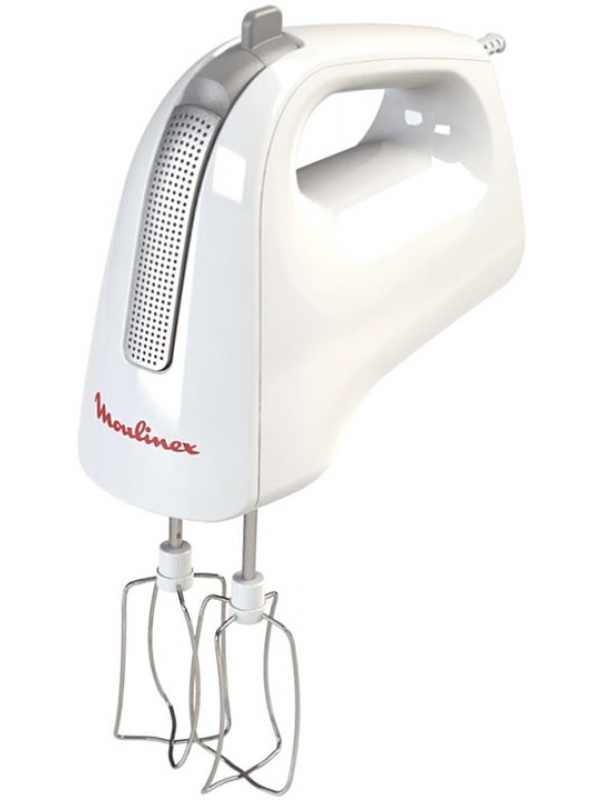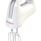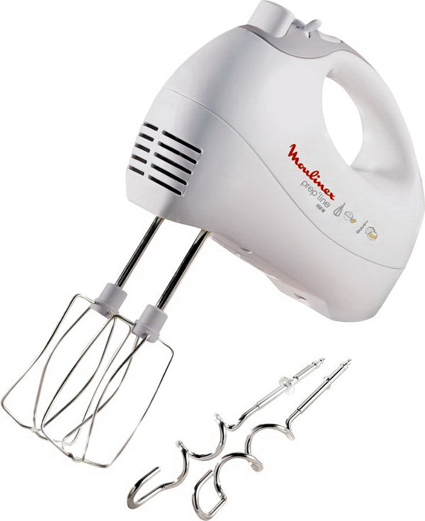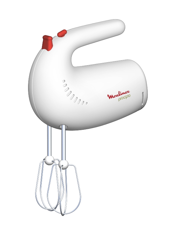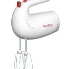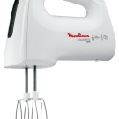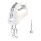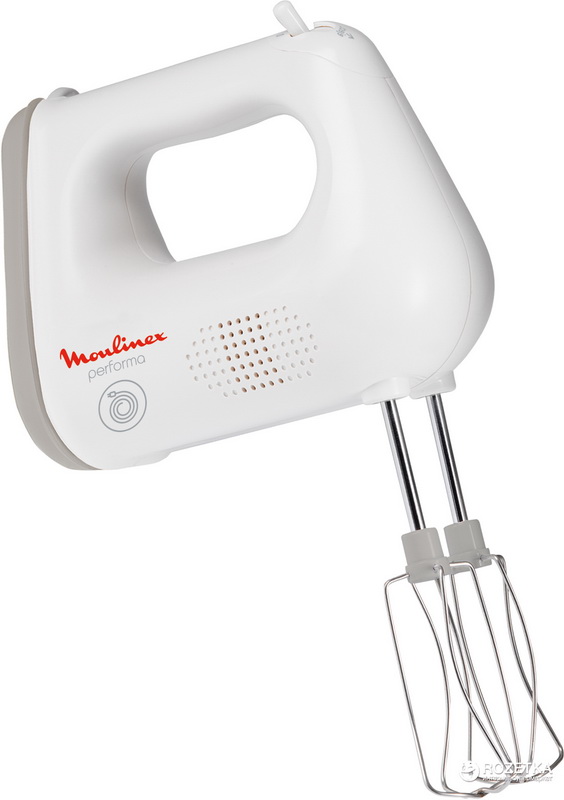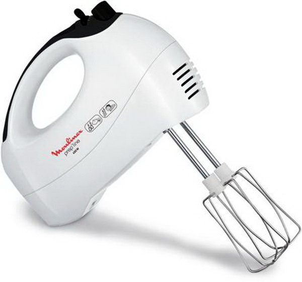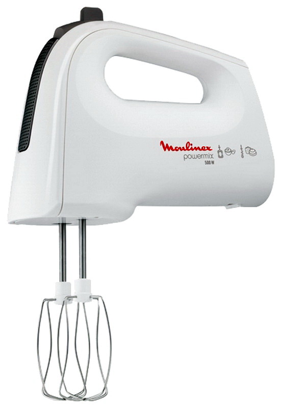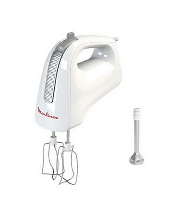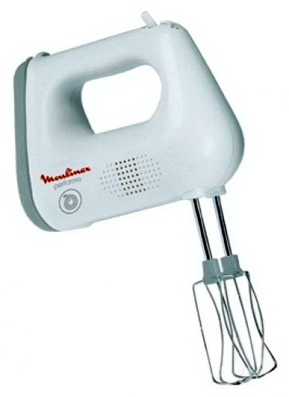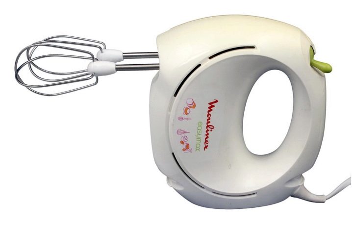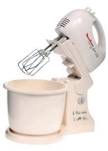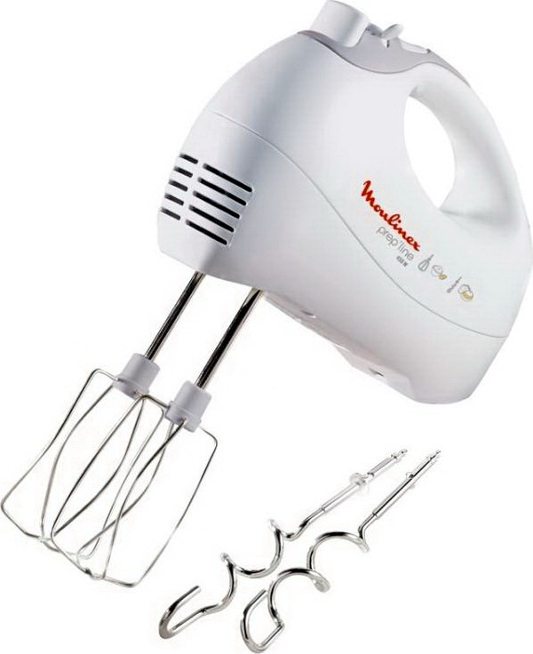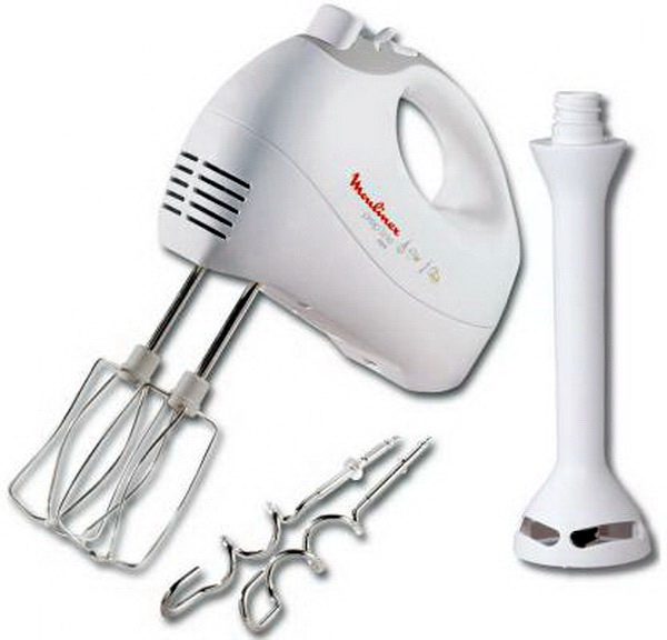 - Le mélangeur à main Moulinex ressemble à un appareil compact conçu pour être tenu dans une main. Sous le boîtier en plastique, le conteneur est occupé par une boîte de vitesses et un moteur électrique, sur lequel le travail de deux batteurs;