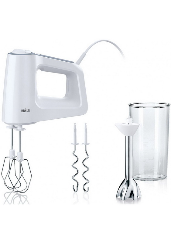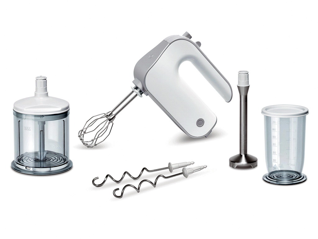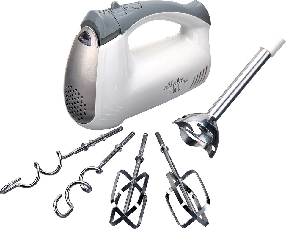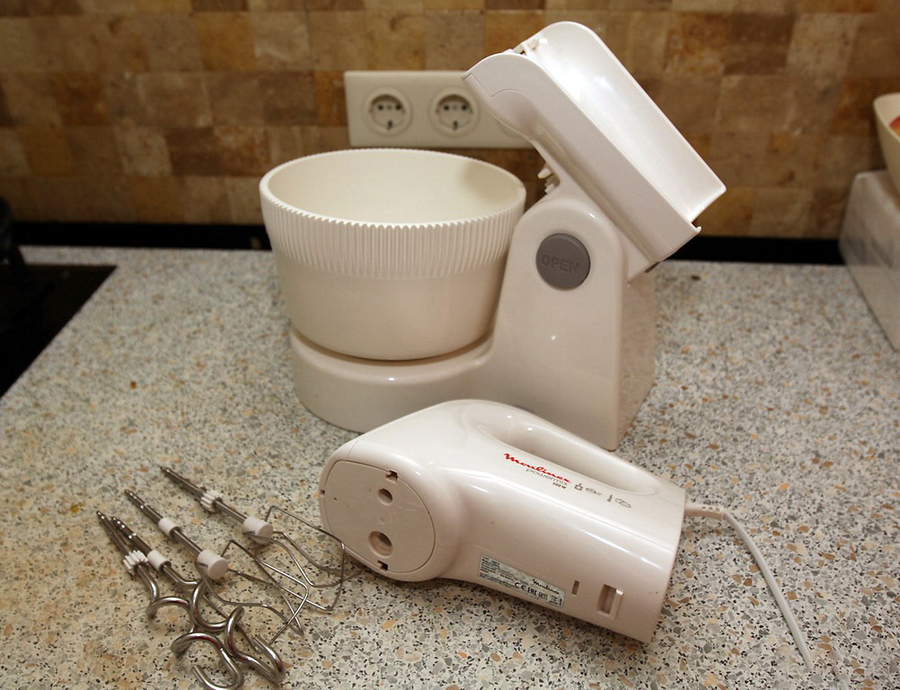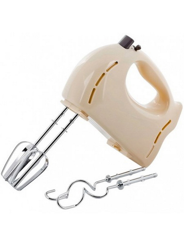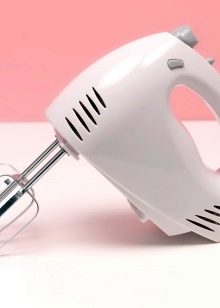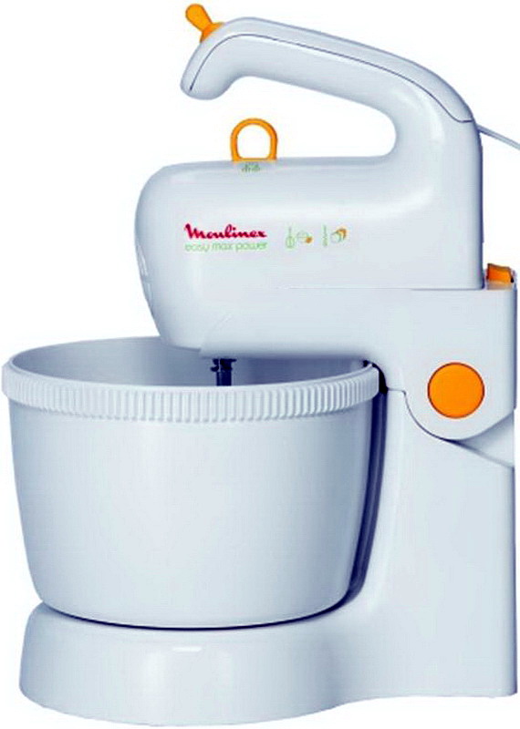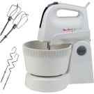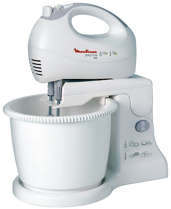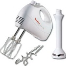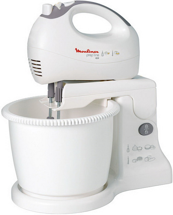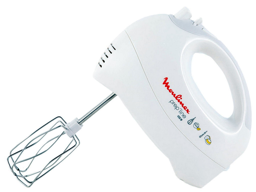 - Le mélangeur à main Moulinex ressemble à un appareil compact conçu pour être tenu dans une main. Sous le boîtier en plastique, le conteneur est occupé par une boîte de vitesses et un moteur électrique, sur lequel le travail de deux batteurs;