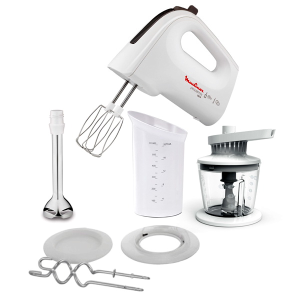 Un autre modèle - le mélangeur mélangeur Moulinex est livré complet avec une buse de mélangeur, des batteurs, des buses de pâte et un mini moulin.Un excellent appareil de cuisine dans lequel plusieurs buses sont assemblées à la fois et il n'est pas nécessaire d'acheter un mélangeur séparément.