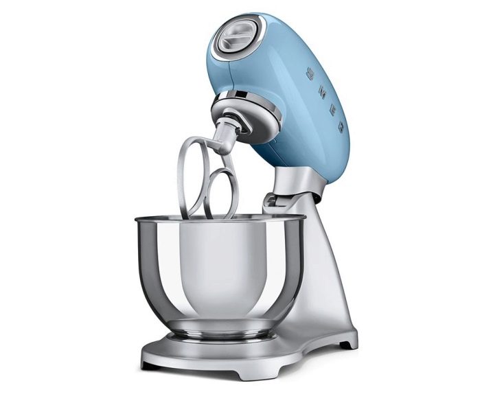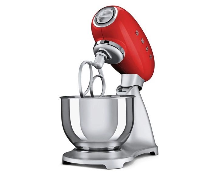 Le mélangeur Smeg SMF01 peut avoir différentes couleurs de la caisse pour tous les goûts: rouge, argent, bleu, bleu. Des modèles avec une puissance de travail de 1000 W et 800 W sont produits, mais ce n'est pas une différence fondamentale, même une unité moins «forte» peut secouer en douceur un cocktail, pétrir une pâte, concasser de la glace ou faire une pâte. La cuvette de l'appareil est en acier inoxydable durable avec une brillance agréable.Son volume est de 4,8 litres, ce qui est suffisant pour préparer n'importe quel plat pour une petite famille.