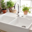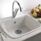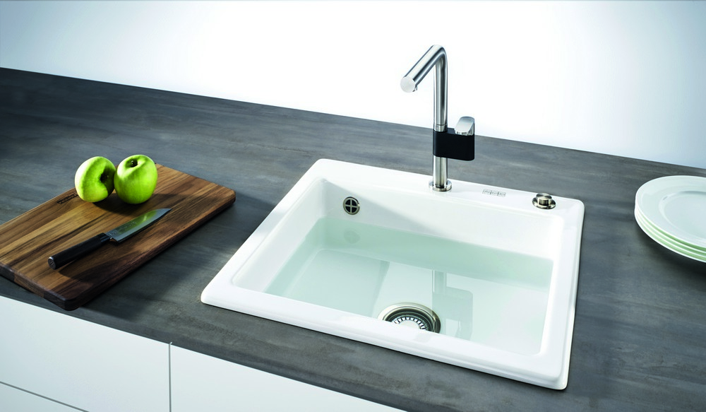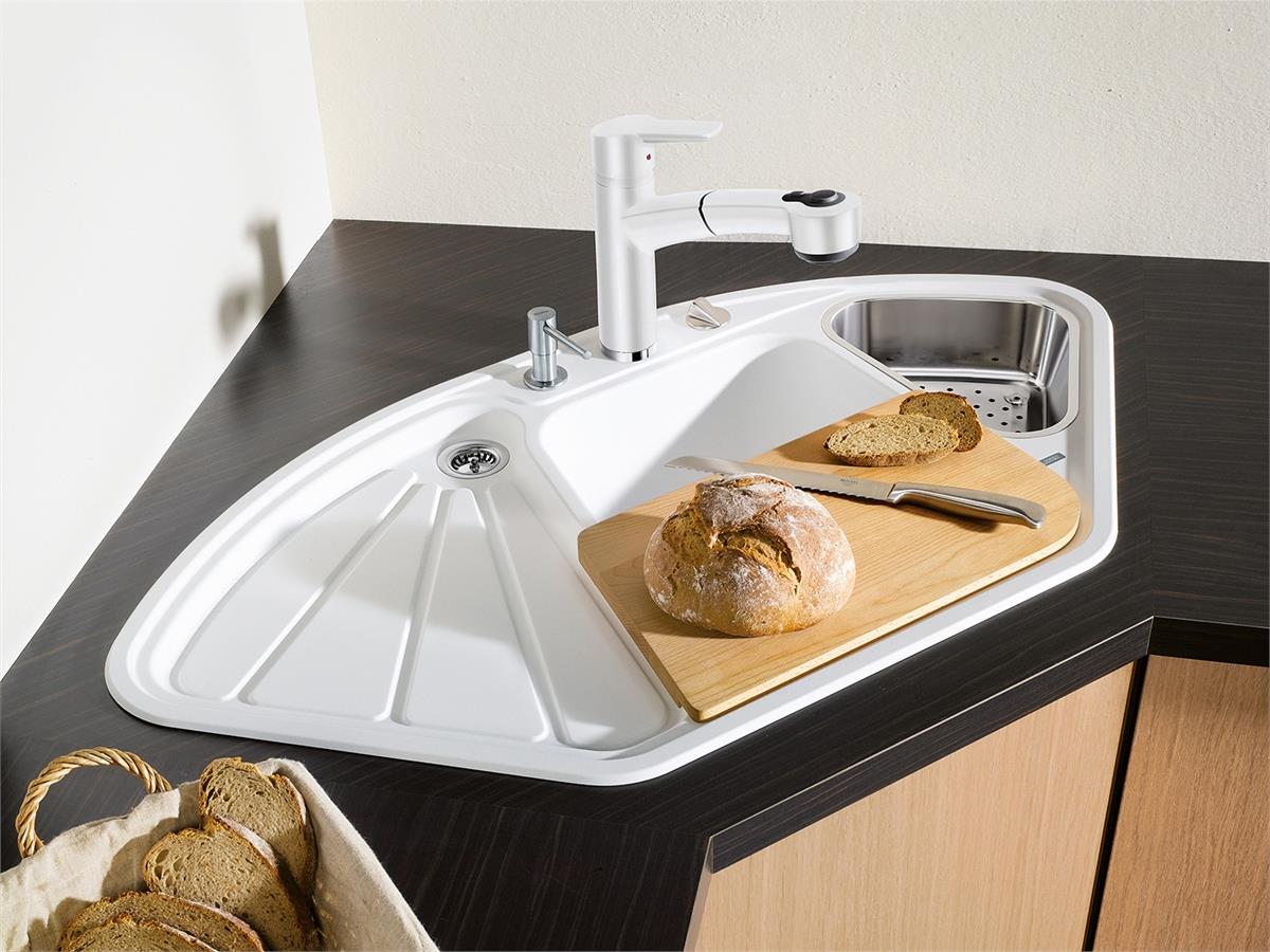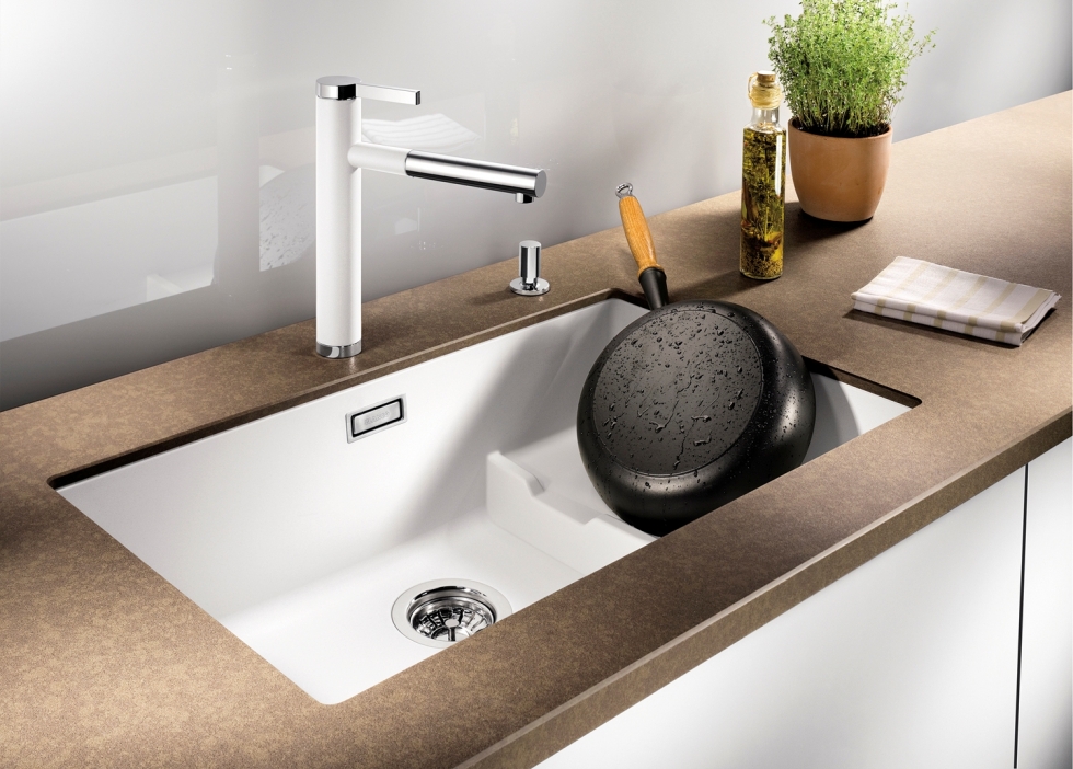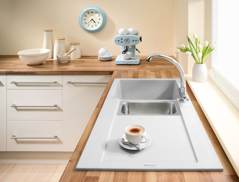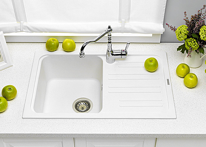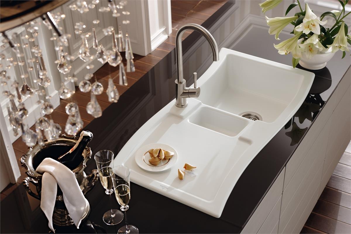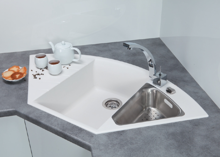 L'évier blanc de neige s'adapte parfaitement à tout intérieur de cuisine et offre une combinaison contrastante avec un plateau de table sombre, par exemple en noyer, aulne, chêne, graphite, etc. , hi-tech et autres.