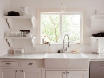 C'est pourquoi il est nécessaire, lors du choix des éviers, des éviers et des éviers pour la cuisine, de faire attention à l'aspect pratique et à la durabilité des matériaux. La couleur blanche exquise et élégante a beaucoup de nuances intéressantes qui entrent dans la catégorie du blanc cassé. Vous pouvez choisir un évier pour un intérieur monochrome entrecoupé de gouttes d'or, une bordure argentée et également prendre un produit monophonique dans la tonalité du lait cuit, de l'ivoire, de l'ivoire, etc.
