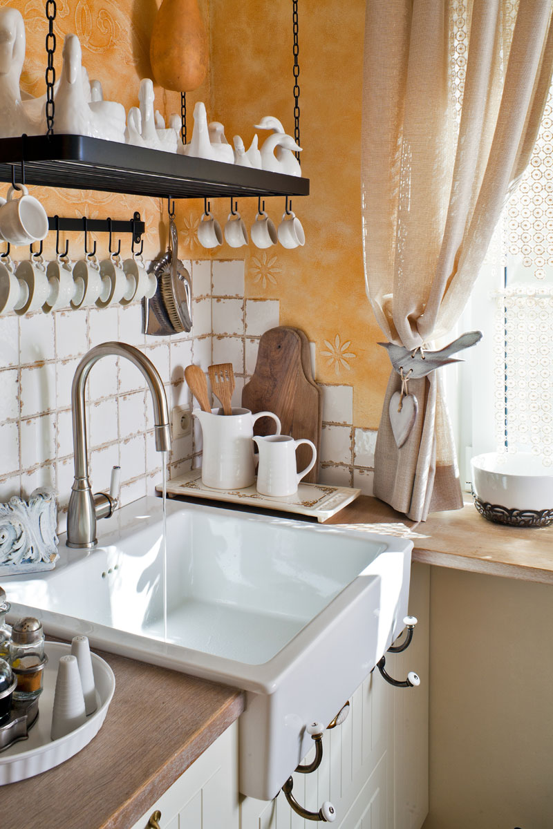 L'évier à mortaise, de couleur blanche, s'harmonise parfaitement avec un distributeur intégré. Ici vous pouvez mettre un nettoyant ménager, des ronds de serviette, des serviettes, un support pour une éponge, des chiffons.