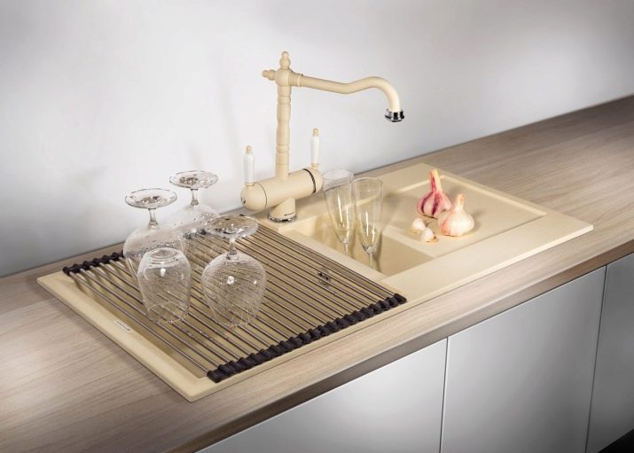 À l'évier, vous pouvez également suspendre un sèche-linge spécial pour nettoyer la vaisselle, ce qui simplifie le nettoyage des assiettes, bols et autres ustensiles de cuisine. Un avantage spécial a une collandre ou un plateau pour drainer l'eau. Ici, vous pouvez décongeler de la viande, du poisson, des légumes et des fruits secs. Certains fabricants équipent les modèles avec une râpe pour le déchiquetage de divers produits. Avec cet accessoire n'aura pas à salir la vaisselle supplémentaire.