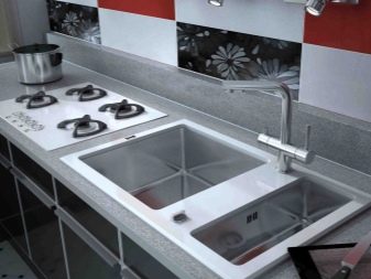- Considérez la taille de votre espace de cuisine.Le lavage doit occuper la place maximale autorisée. Pour elle, la plate-forme est conçue à l'avance, avant que les meubles du casque ne soient placés.
