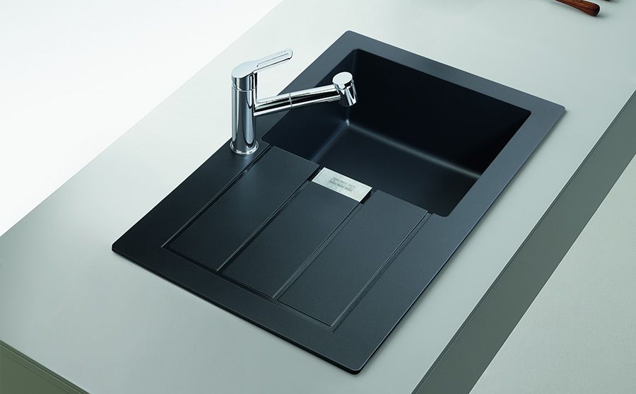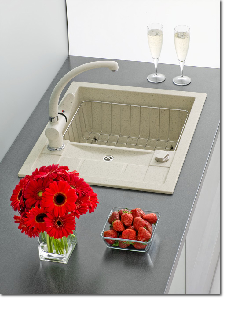 L'avant et les côtés de la coque sont faits de côtés, ce qui lui permet de se fixer solidement au socle. Derrière l'évier est soulevé, afin que l'eau ne se répand pas au-delà de l'évier. Pour faciliter le nettoyage, cet élément d’intérieur de cuisine a une forme essentiellement rectangulaire et ses bords sont lissés.