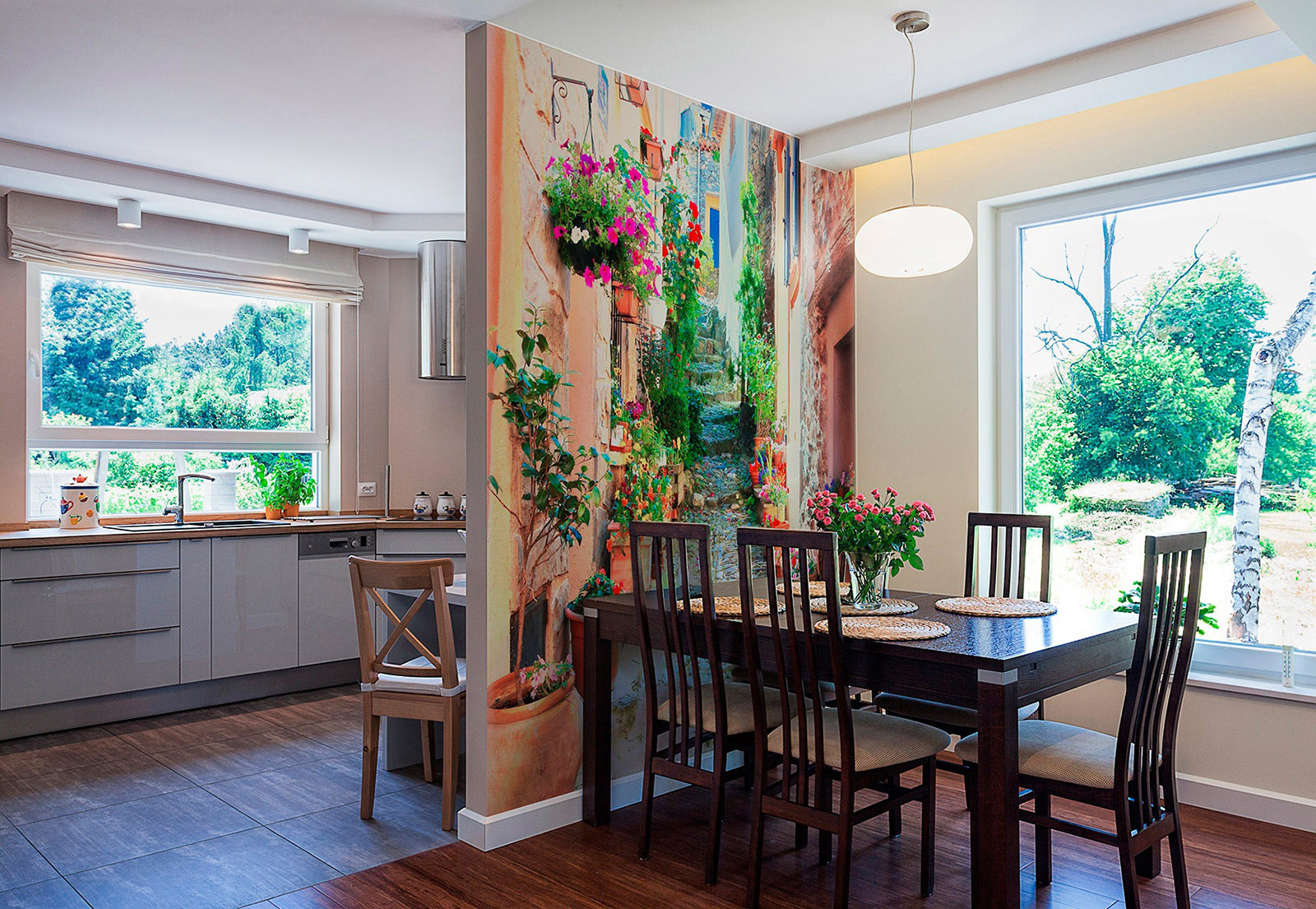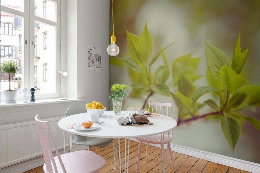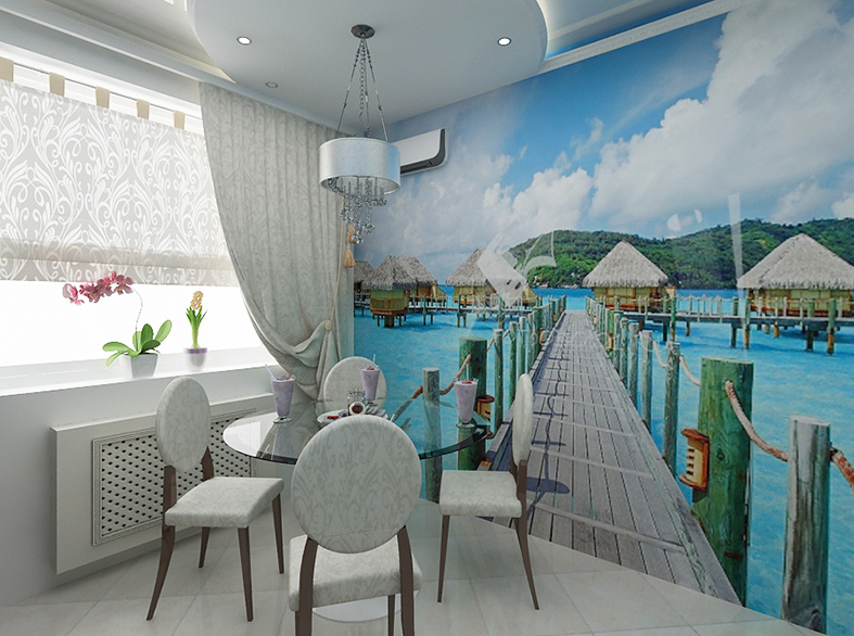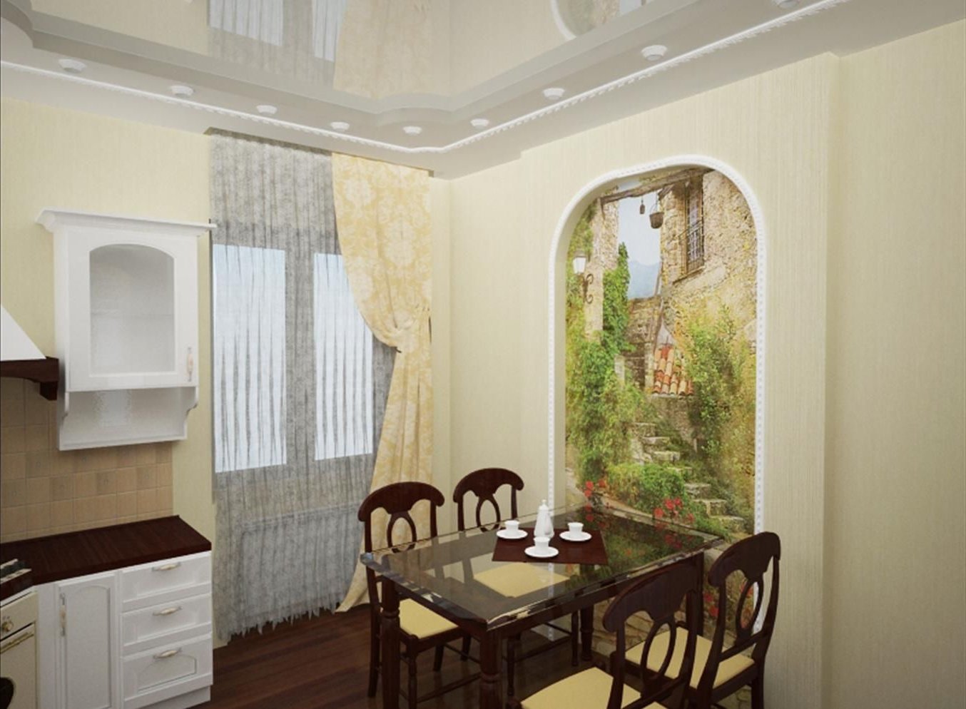 Pour une petite cuisine, un simple dessin serait une excellente option, par exemple, des champs avec des fleurs, des arbres avec des feuilles, un ornement, un panorama d’une ville ou d’une petite rue, alignés "sous une pierre", l’imitation d’une fenêtre ou d’une porte.