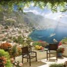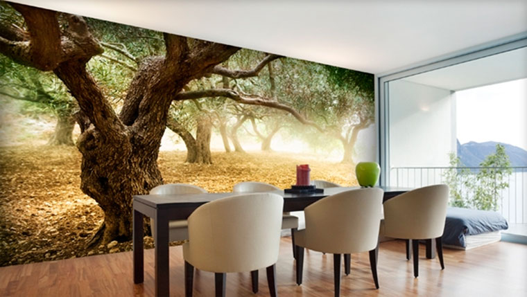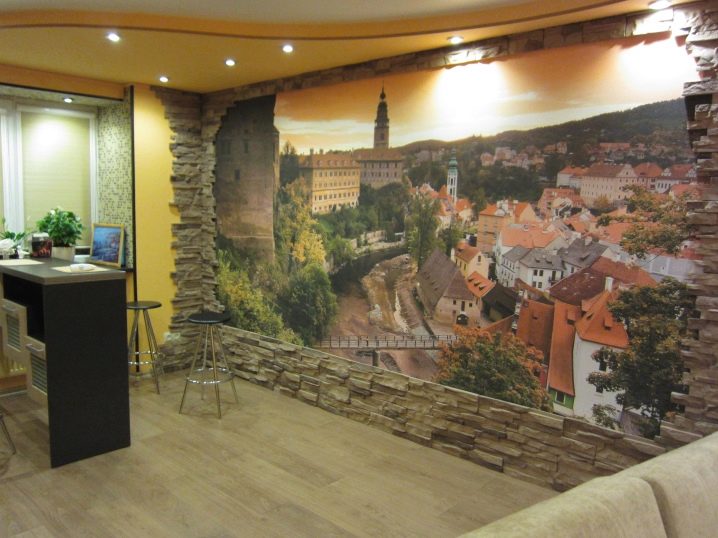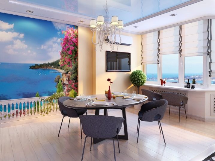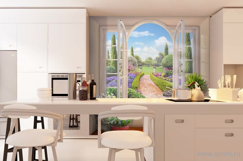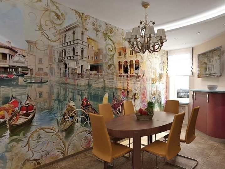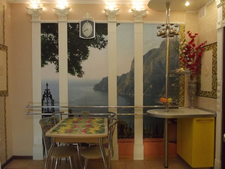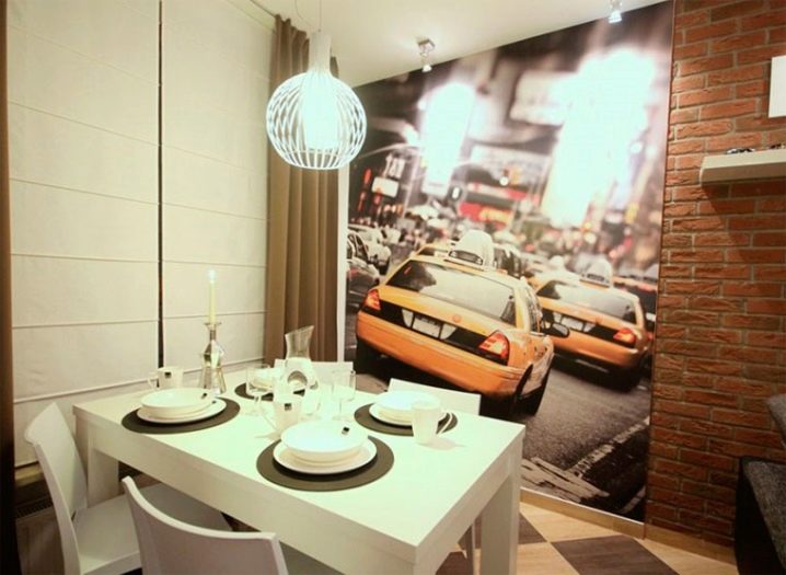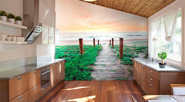 Pour une petite cuisine, un simple dessin serait une excellente option, par exemple, des champs avec des fleurs, des arbres avec des feuilles, un ornement, un panorama d’une ville ou d’une petite rue, alignés "sous une pierre", l’imitation d’une fenêtre ou d’une porte.