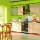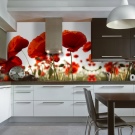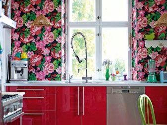 Choisissez un papier peint vinyle lisse ou en relief fabriqué à l'aide de la technologie de sérigraphie. Ils peuvent venir avec des impressions vertes ou rouges, des motifs contrastant sur le fond de la cuisine. Vous pouvez également utiliser la finition pour les murs sous forme de vinyle mousse. Les couleurs de la couleur dureront longtemps et ne se décoloreront pas, même si elles sont exposées à la lumière directe du soleil. Un tel modèle peut être repeint jusqu'à 10 fois, changeant votre humeur de mélancolique à romantique.
