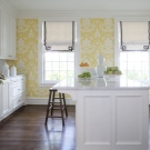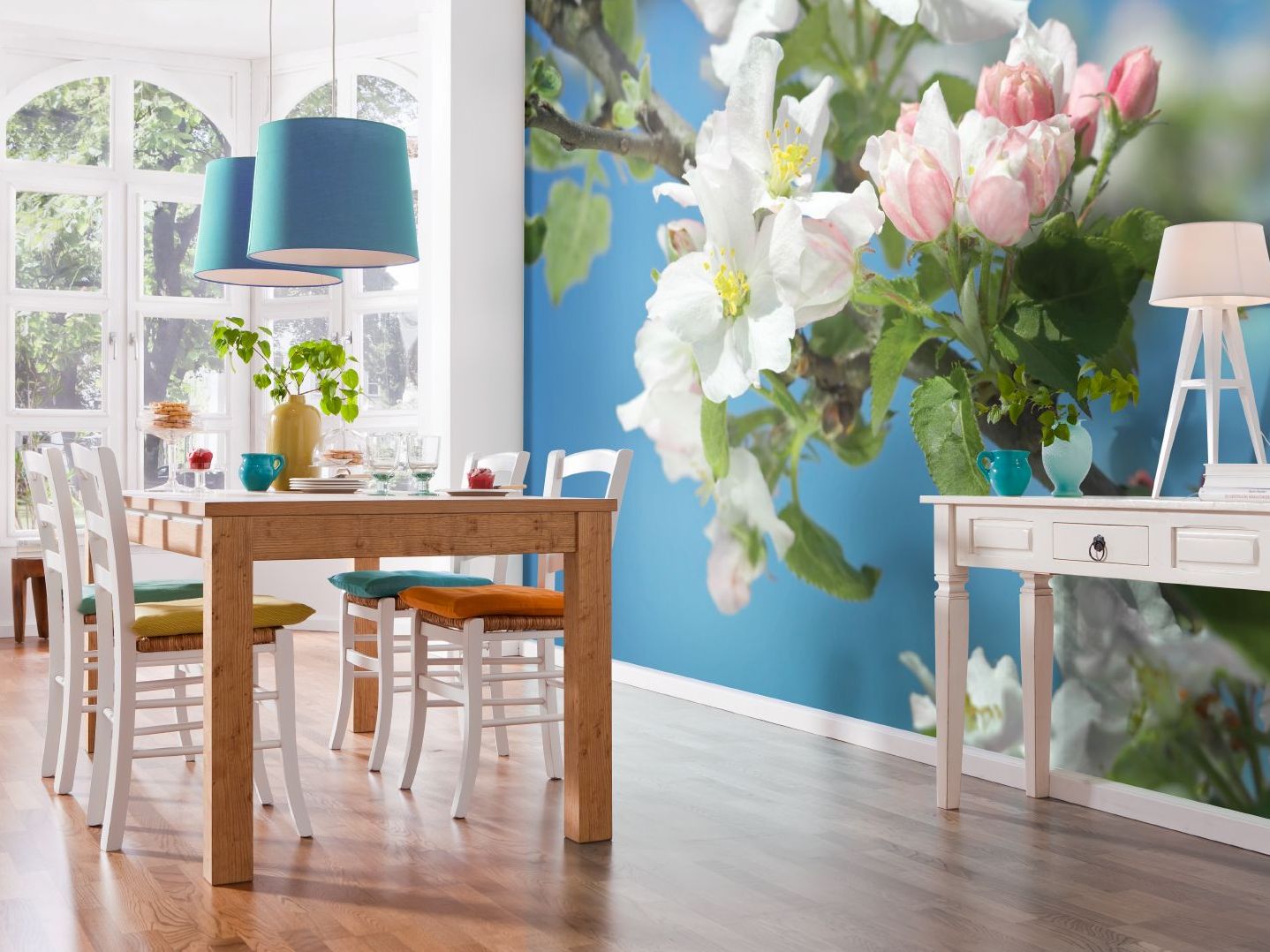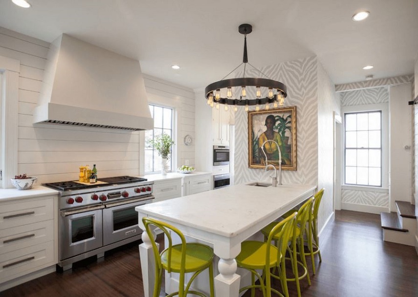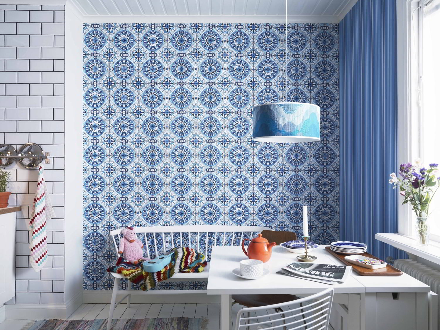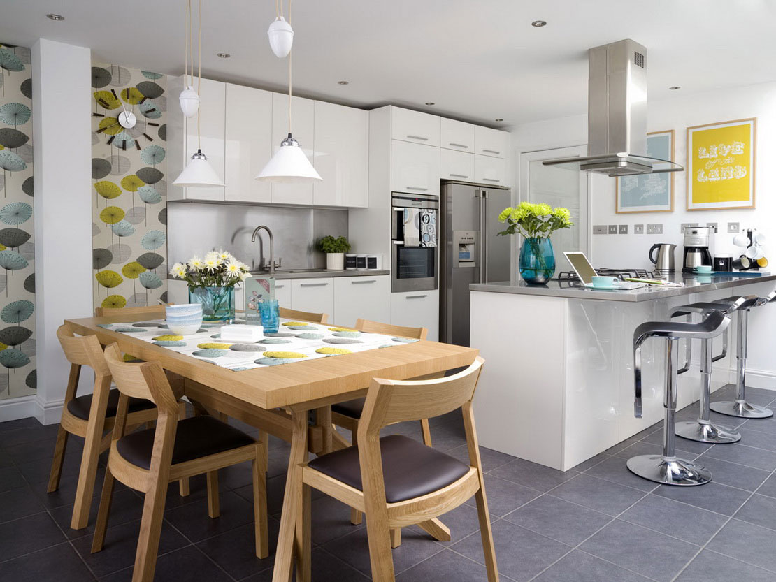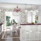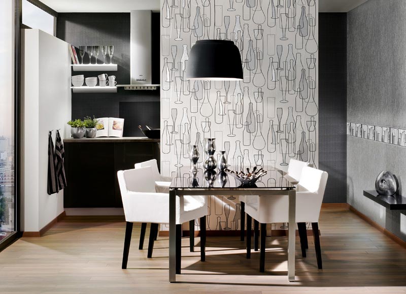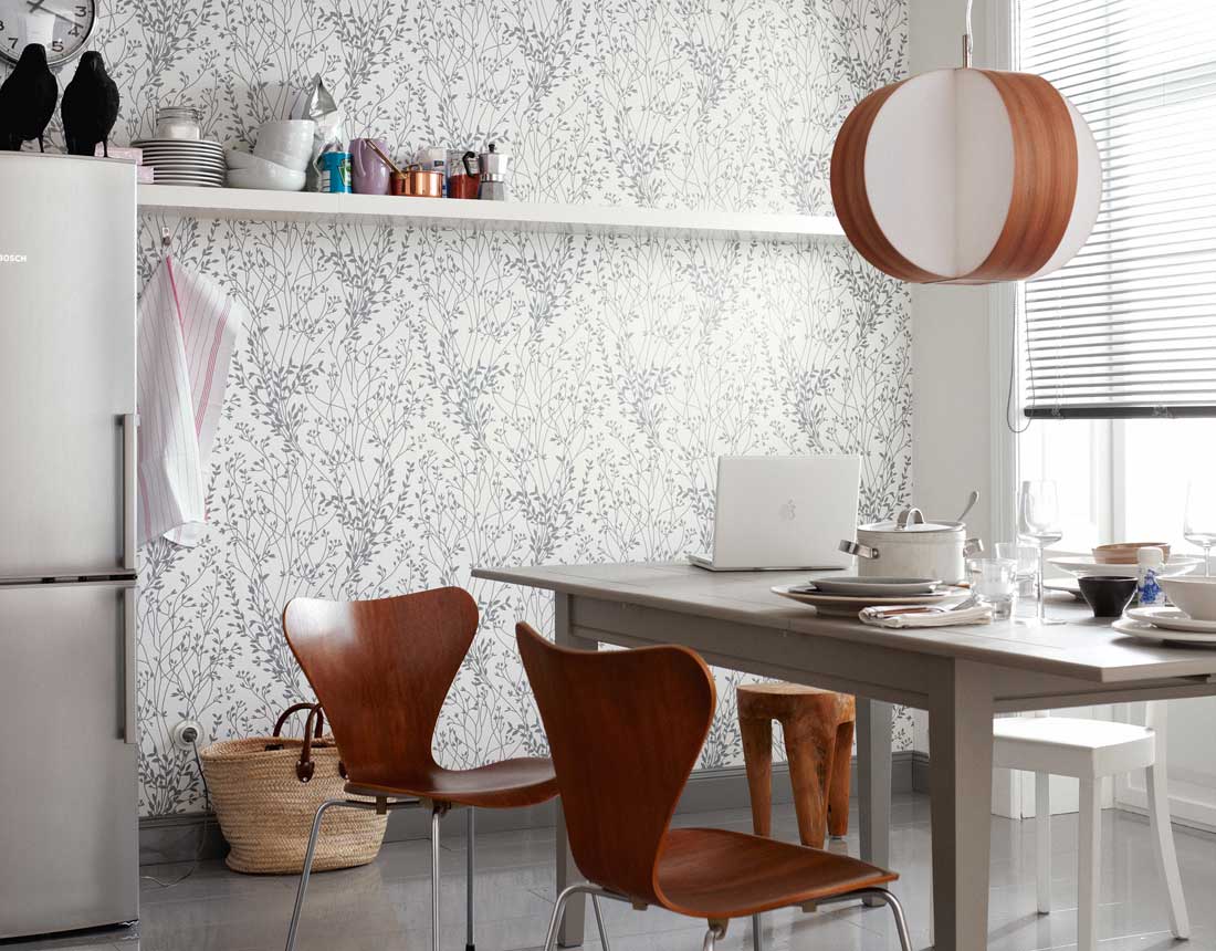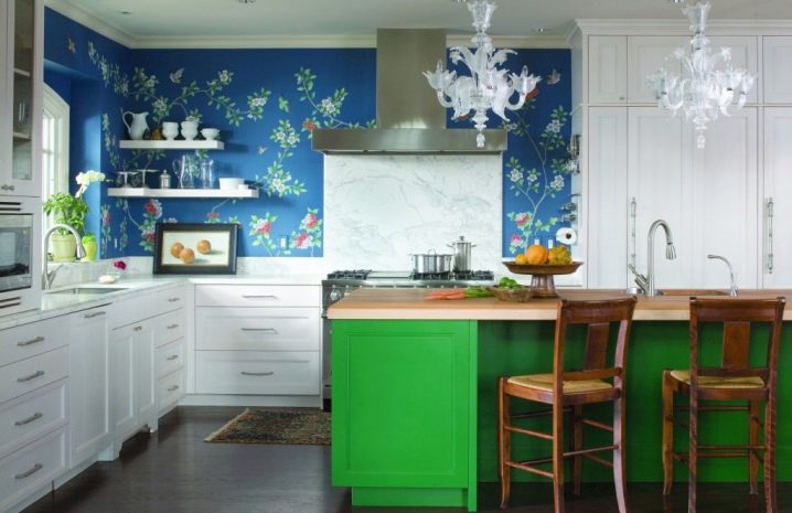 Les fans de style scandinave ou classique adoreront les couleurs vives de la cuisine. Sur un fond blanc de grands tirages, des dessins et des animaux, des insectes, des objets abstraits seront superbes. Pour un ensemble provincial, essayez de choisir un papier peint avec un petit motif (cage, pois et autres "géométries").